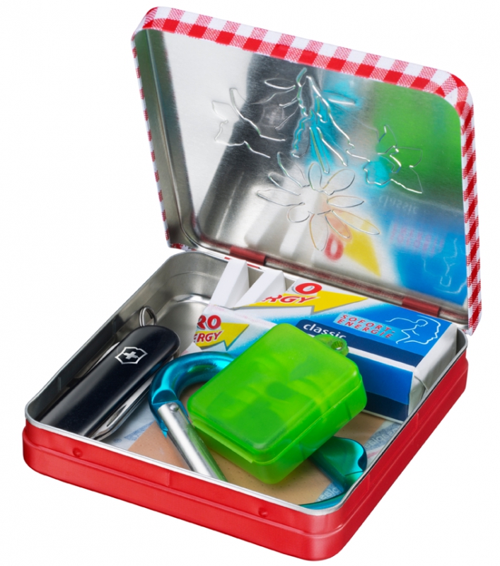 Blechdose eckig, bedruckt, leer Innenmasse LxBxH: 8.75 x 8.40 x 1.75 cm Gewicht: 40 g