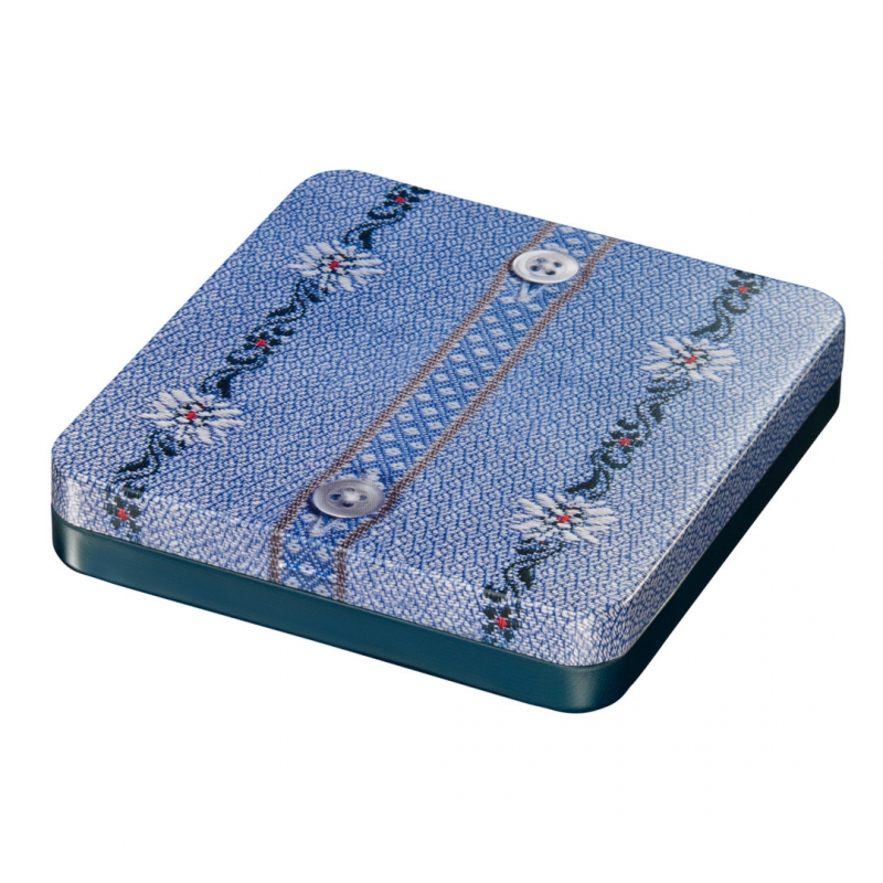 Blechdose eckig, bedruckt, leer Innenmasse LxBxH: 8.75 x 8.40 x 1.75 cm Gewicht: 40 g