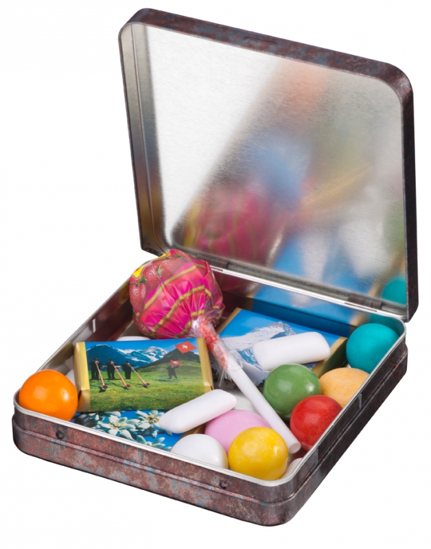 Blechdose eckig, bedruckt, leer Innenmasse LxBxH: 8.75 x 8.40 x 1.75 cm Gewicht: 40 g