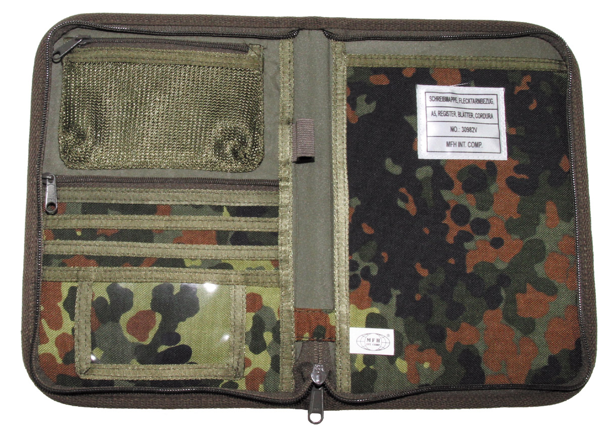 Klettflauschpatch ca. 11 x 2,5 cm vorne komplett aufklappbar mit Reissverschluss 3 Einschubfächer 1 Ausweishülle 1 Einschubfach mit Reissverschluss 1 Netzfach mit Reissverschluss 1 Stifthalter 1 grosses Einschubfach für Notizblock Masse: ca. 18 x 26 x 2,5 cm (B x H x T)