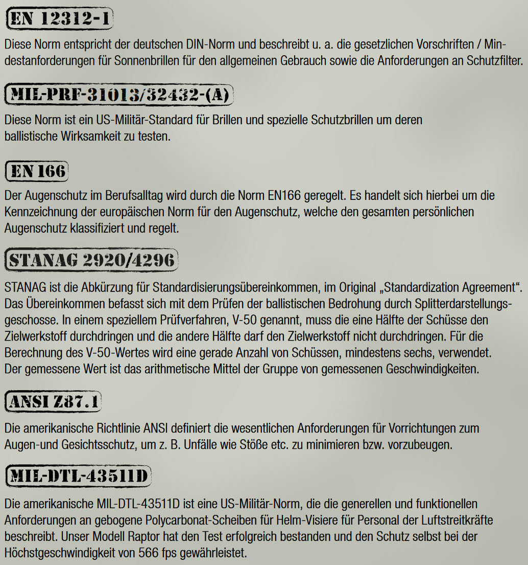 Zertifiziert nach: EN 12312-1 / ANSI Z87.1 / STANAG 2920