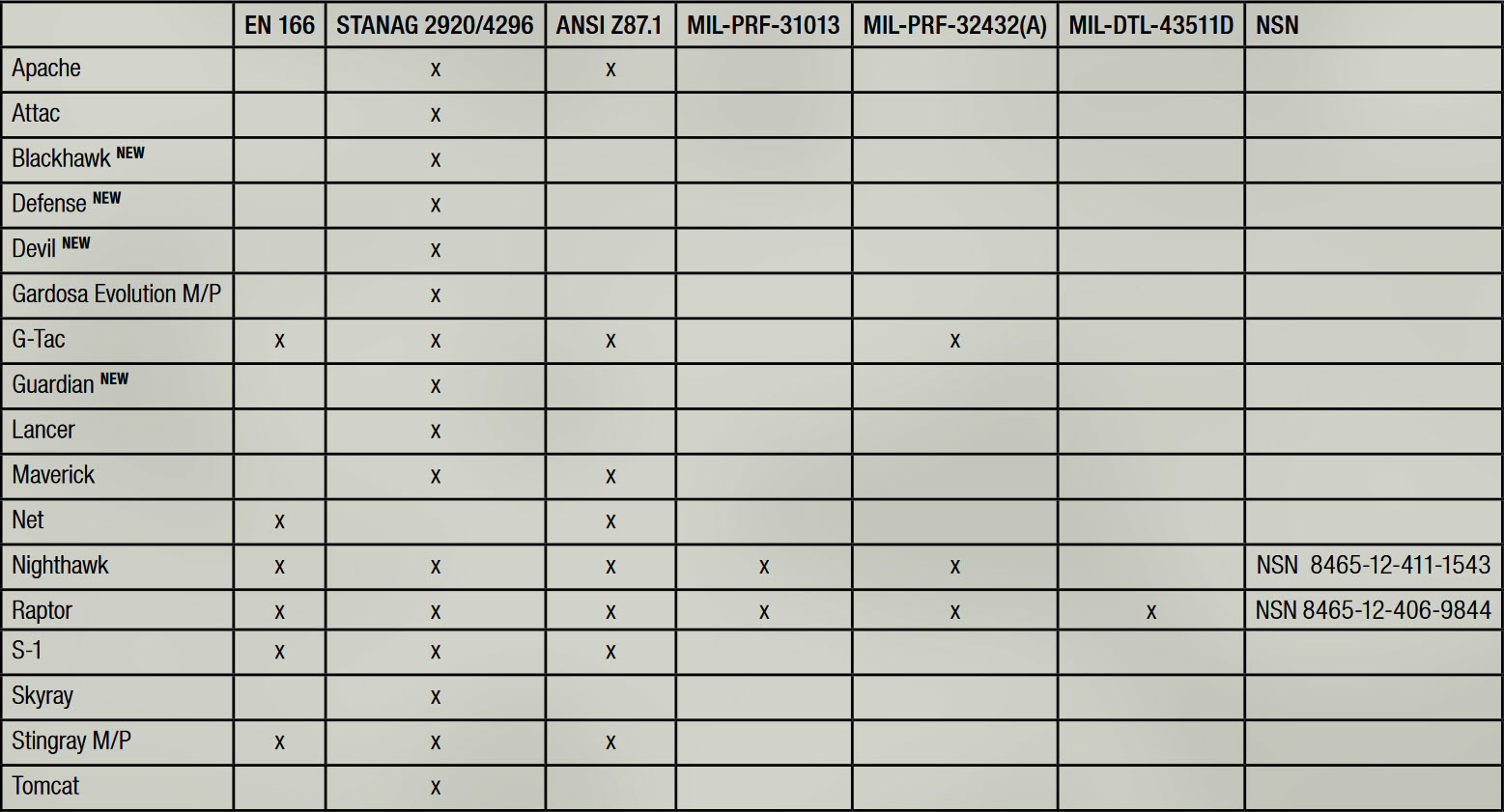 Zertifiziert nach: EN 12312-1 / MIL-PRF-31013/32432A / MIL-DTL-43511D / ANSI Z87.1 / STANAG 2920/4296 / EN 166F