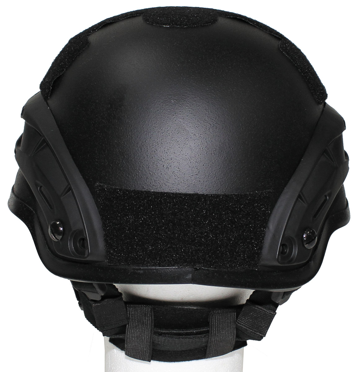 hochwertiger ABS-Kunststoffhelm verstellbarer 4-Punkt Riemen am Kinn und Nacken Innenpolster (7 Stk.) abnehmbar und verstellbar Klettflauschpatches an der Helmaussenseite Rails links und rechts, inkl. 2 Montagen Mount-Grundplatten (NVG) für z.B. Nachtsichtgeräte Einheitsgrösse