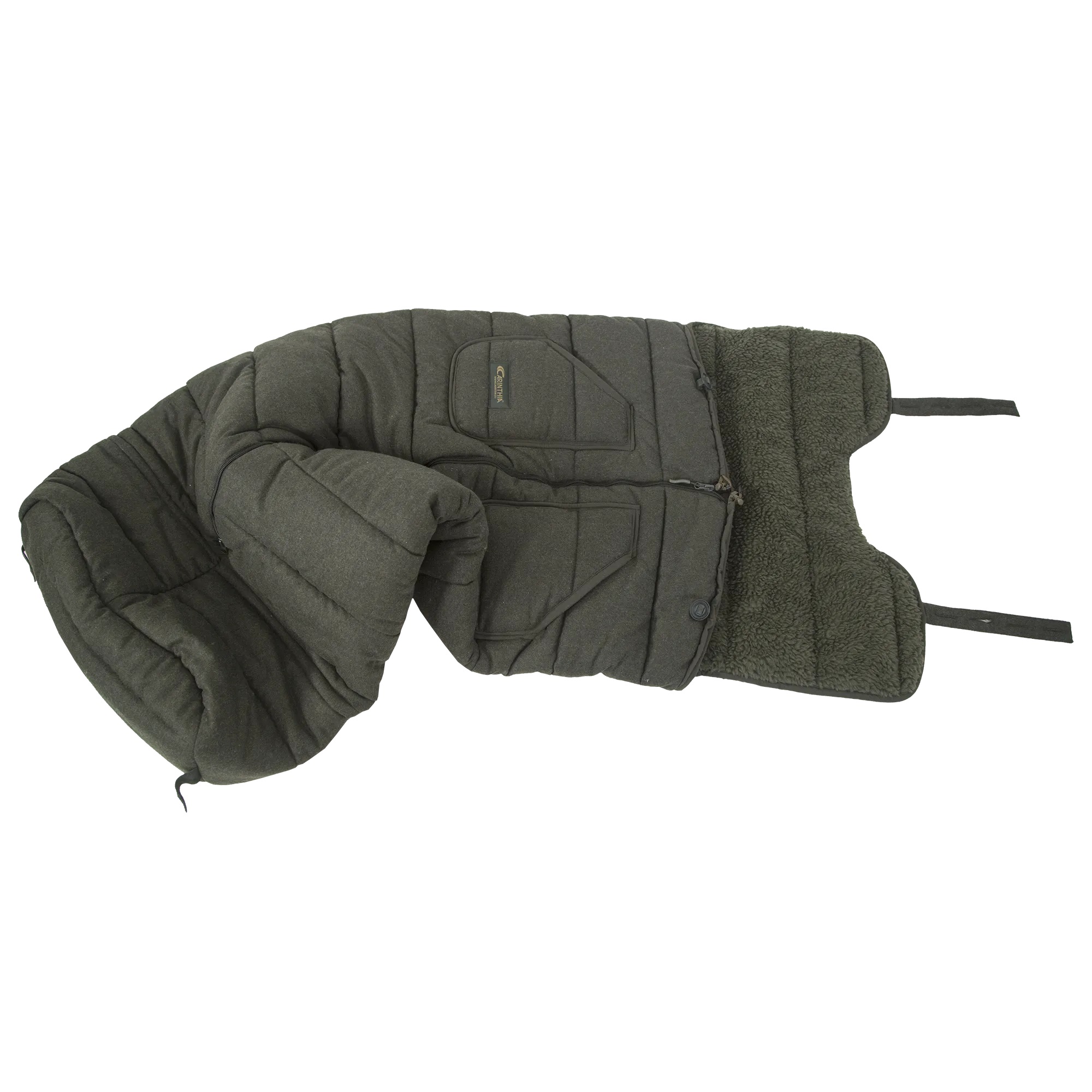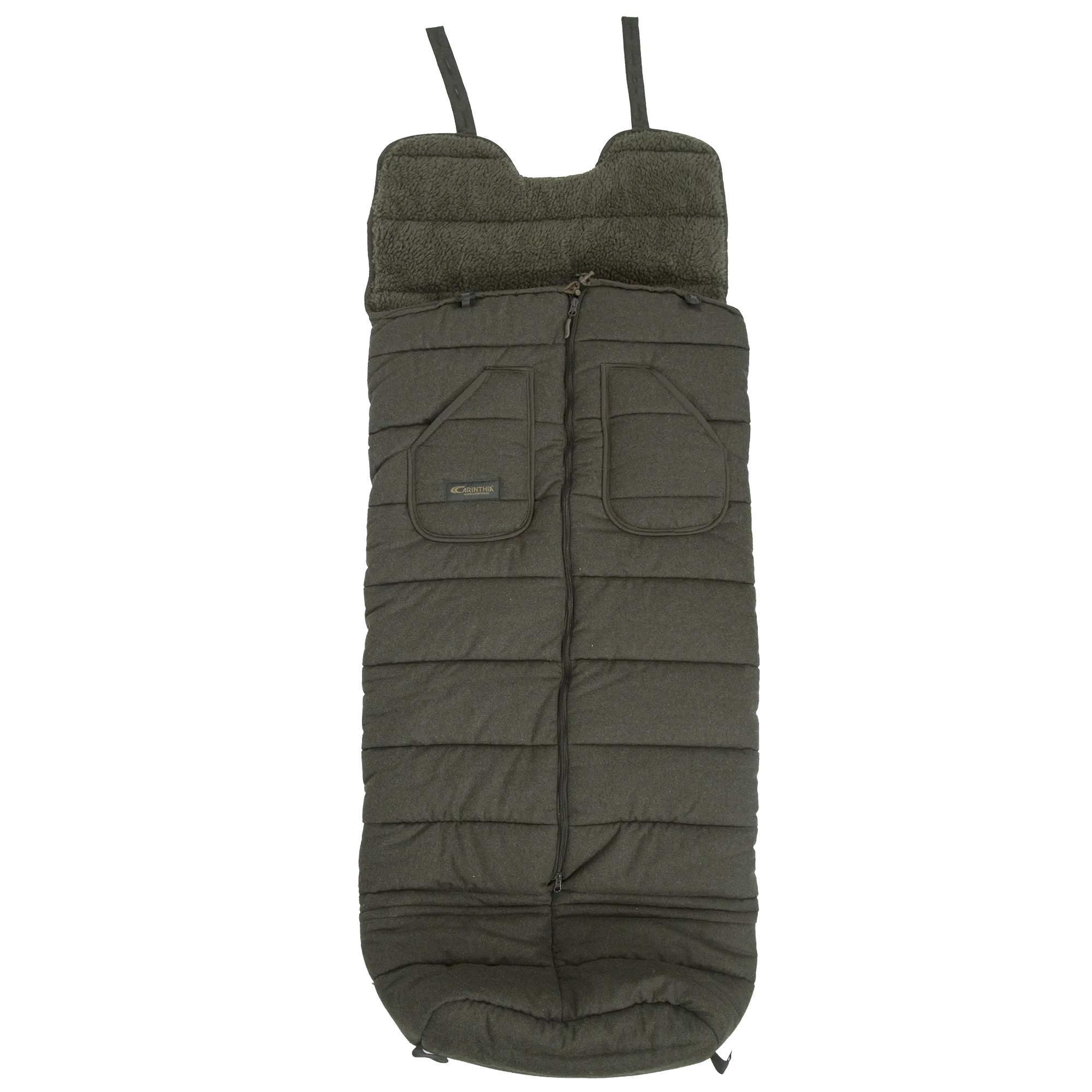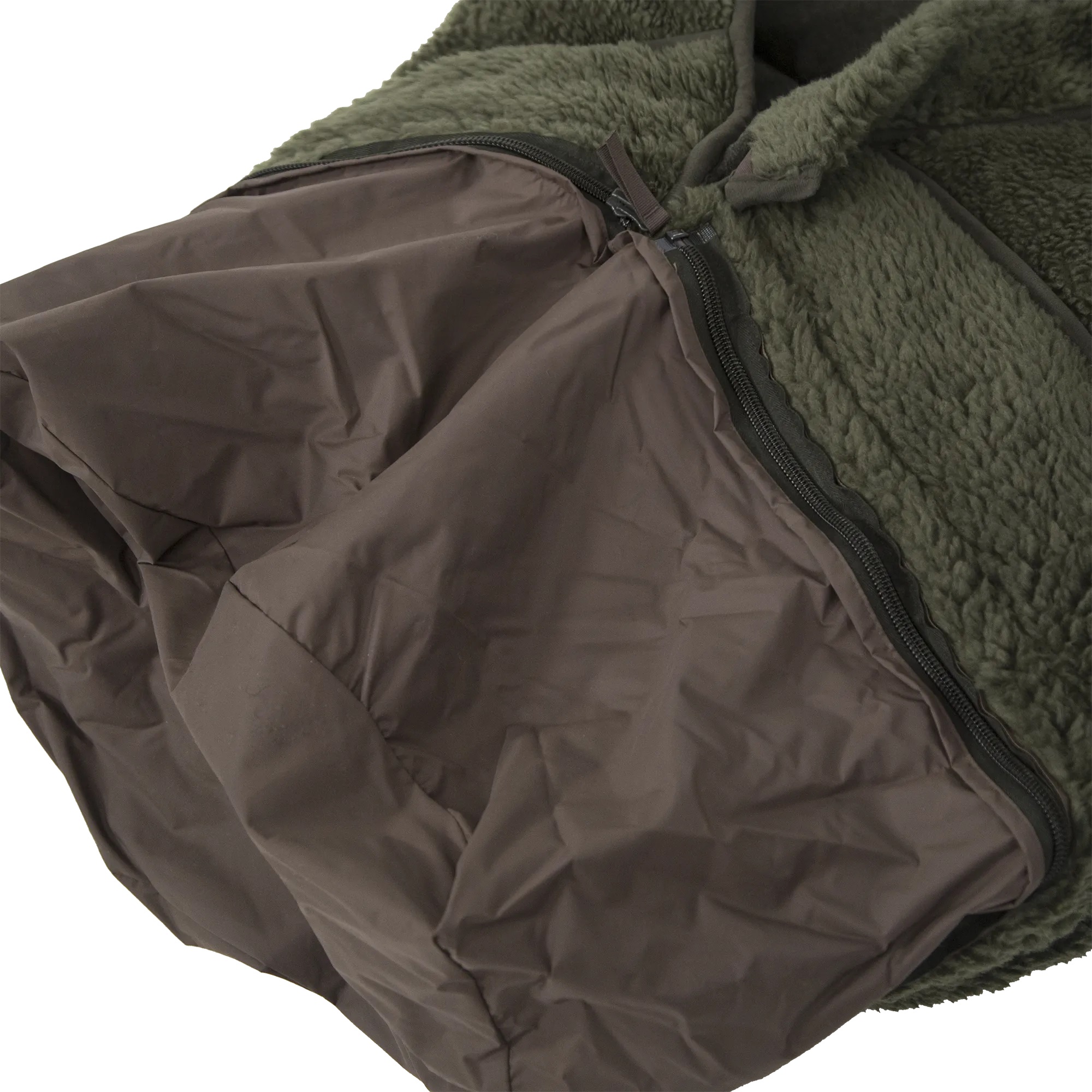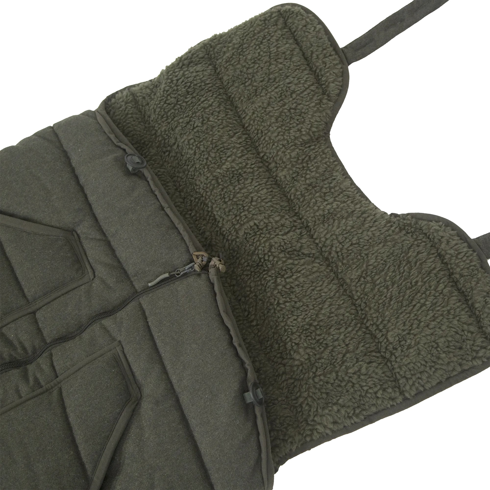 Das flauschige Innenfutter bietet zusätzlichen Wärmekomfort bei extrem niedrigen Temperaturen. Um einen Wärmeverlust zu vermeiden, wurde im Brustbereich ein Kordelzug integriert, den man variabel zuziehen kann. Der Mittel-Zipper/Reißverschluss bietet einen schnellen Aus- und Einstieg. Für einen Standortwechsel muss man den Ansitzsack nicht komplett ausziehen, denn am Fußende befindet sich eine Lederlasche, mit der man den Ansitzsack nach hinten oder nach vorne klappen und im Hüftbereich fixieren kann. Somit ist man mobil ohne ihn ausziehen zu müssen. Der vorne angebrachte Muff mit großen seitlichen Eingriffen bietet Schutz vor kalten Händen. Ein einzippbarer Fußsack aus wasserfestem und robustem Material verhindert eine Verschmutzung des Ansitzsackes.