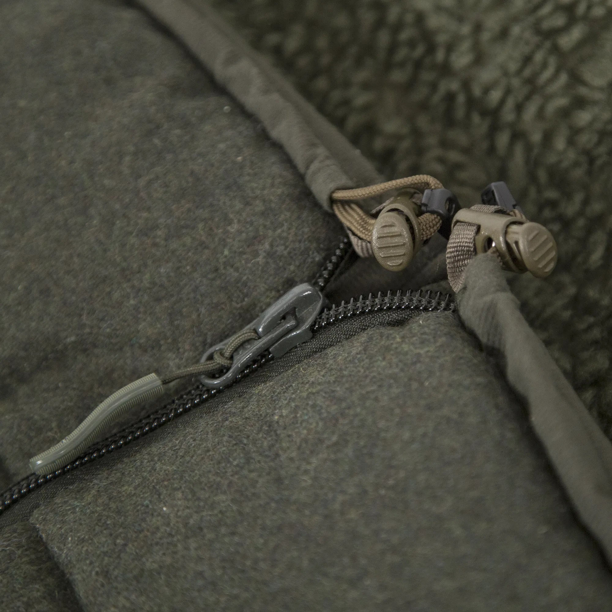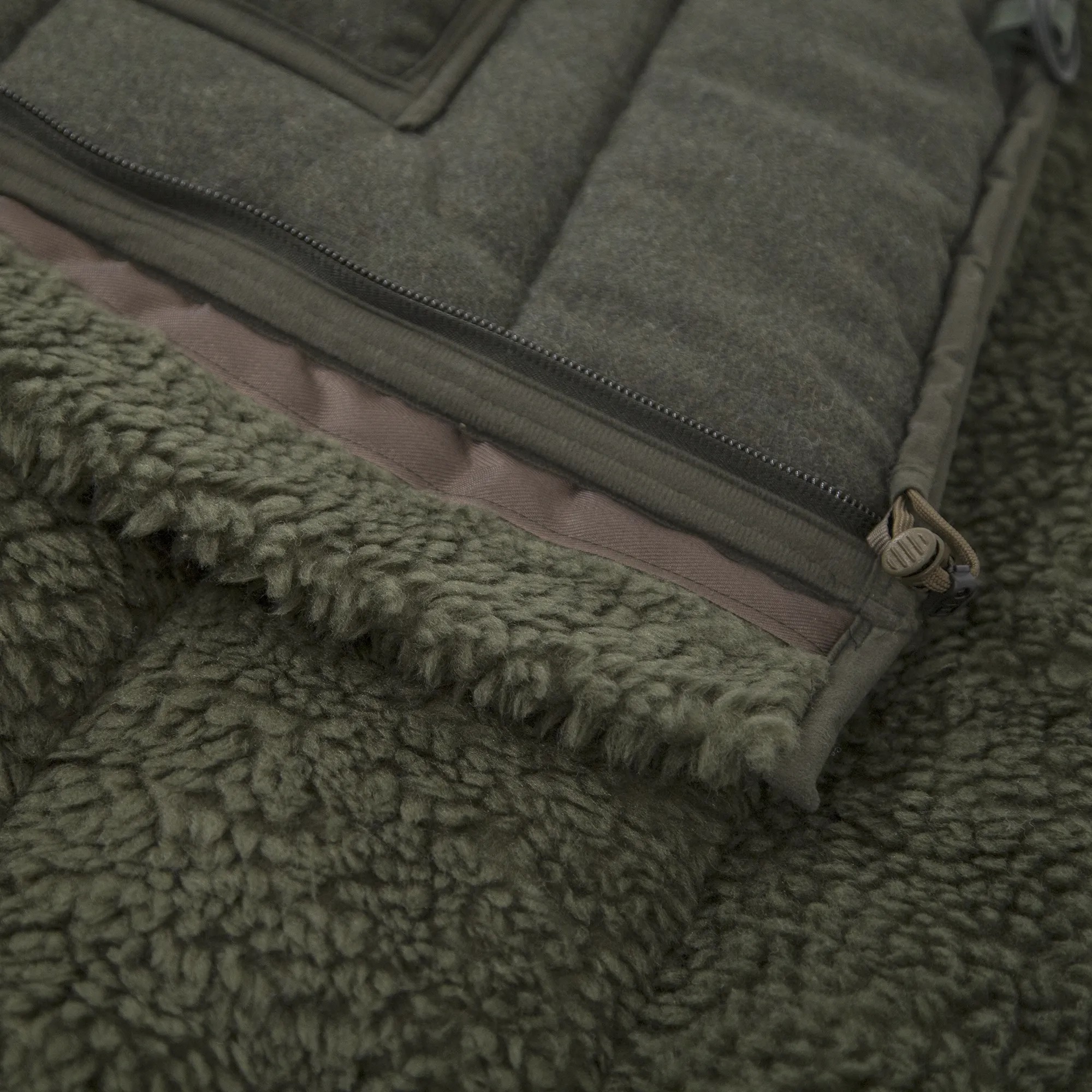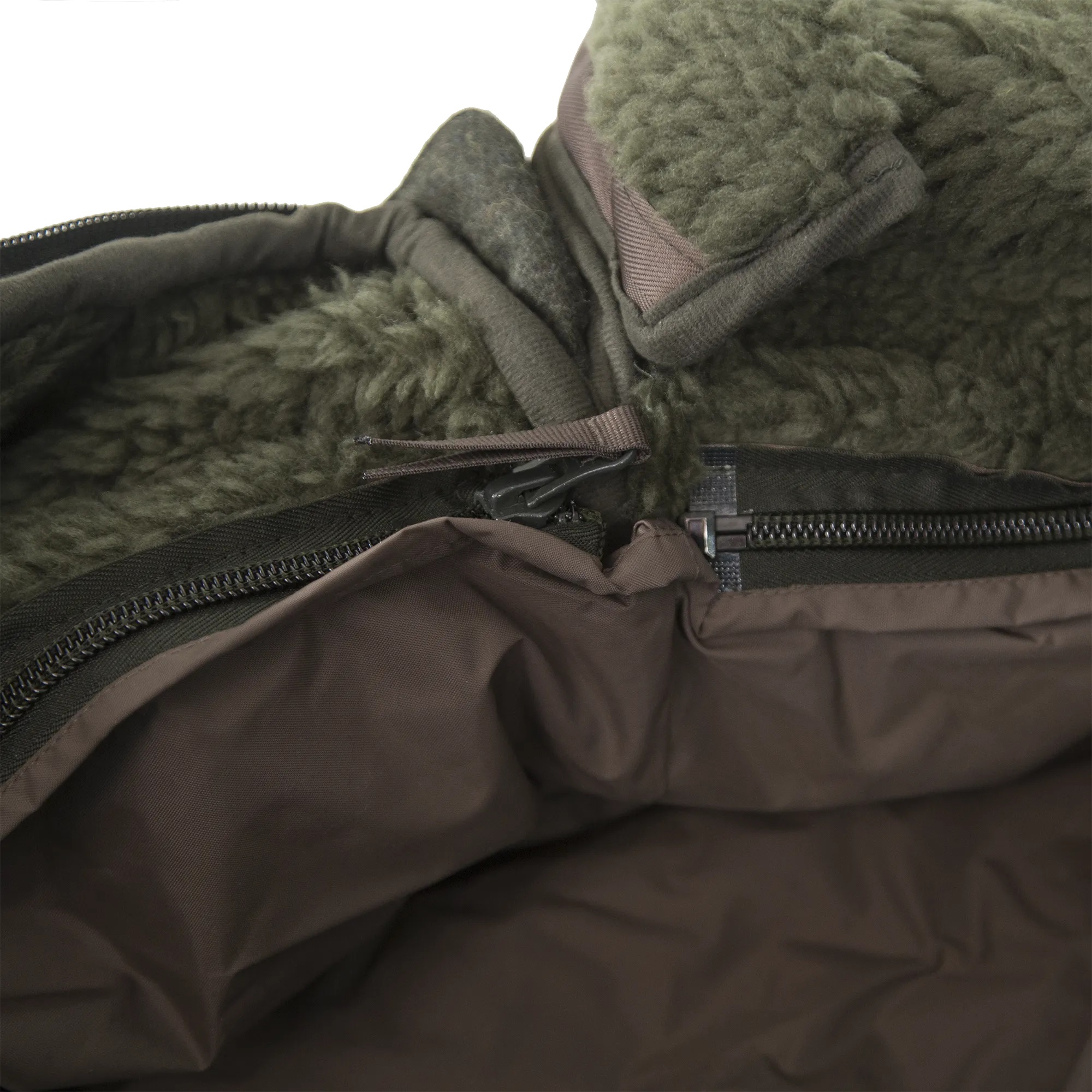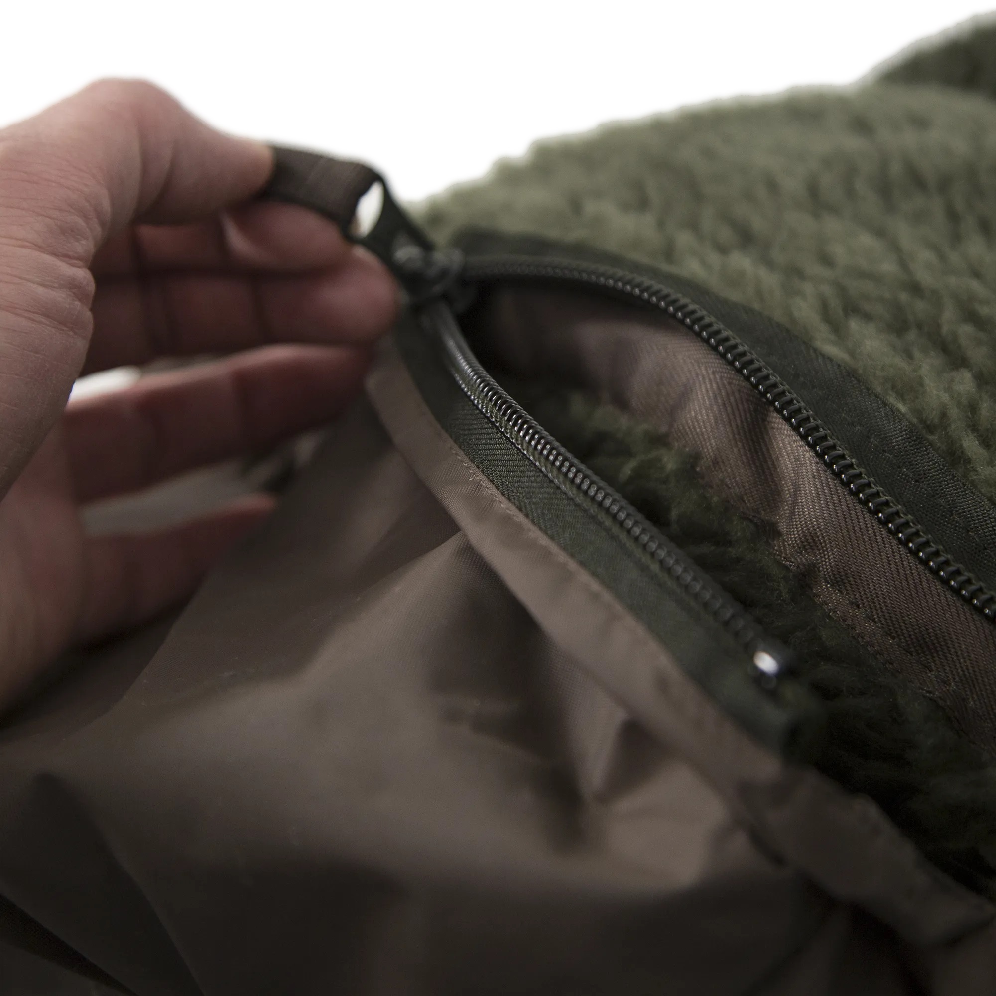 Das flauschige Innenfutter bietet zusätzlichen Wärmekomfort bei extrem niedrigen Temperaturen. Um einen Wärmeverlust zu vermeiden, wurde im Brustbereich ein Kordelzug integriert, den man variabel zuziehen kann. Der Mittel-Zipper/Reißverschluss bietet einen schnellen Aus- und Einstieg. Für einen Standortwechsel muss man den Ansitzsack nicht komplett ausziehen, denn am Fußende befindet sich eine Lederlasche, mit der man den Ansitzsack nach hinten oder nach vorne klappen und im Hüftbereich fixieren kann. Somit ist man mobil ohne ihn ausziehen zu müssen. Der vorne angebrachte Muff mit großen seitlichen Eingriffen bietet Schutz vor kalten Händen. Ein einzippbarer Fußsack aus wasserfestem und robustem Material verhindert eine Verschmutzung des Ansitzsackes.
