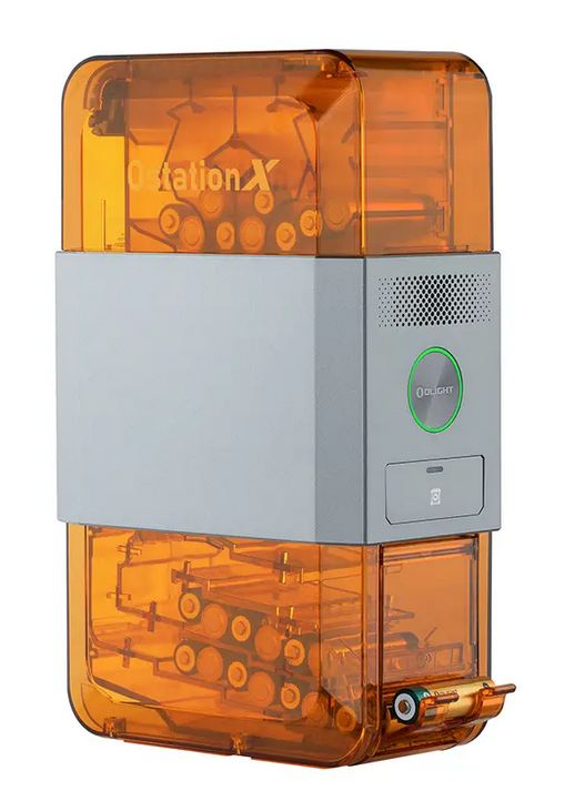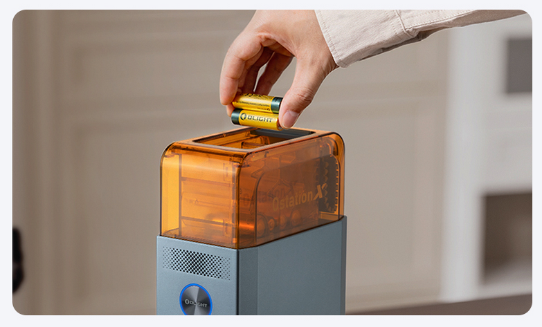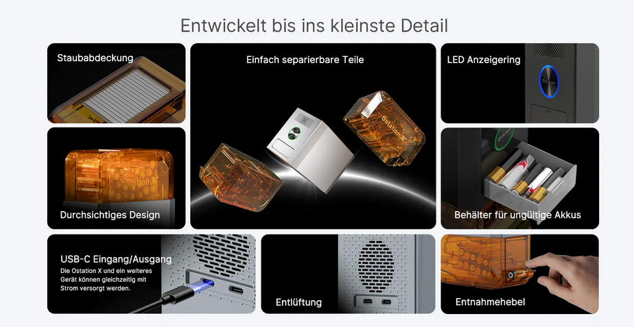 Die Ostation X verfügt über ein geräumiges Aufbewahrungsfach, das bis zu 32 vollgeladene AA. Nach dem Ladevorgang werden die Akkus automatisch sortiert: funktionstüchtige Batterien gelangen ins Lagerfach, während defekte in ein separates Fach aussortiert werden.