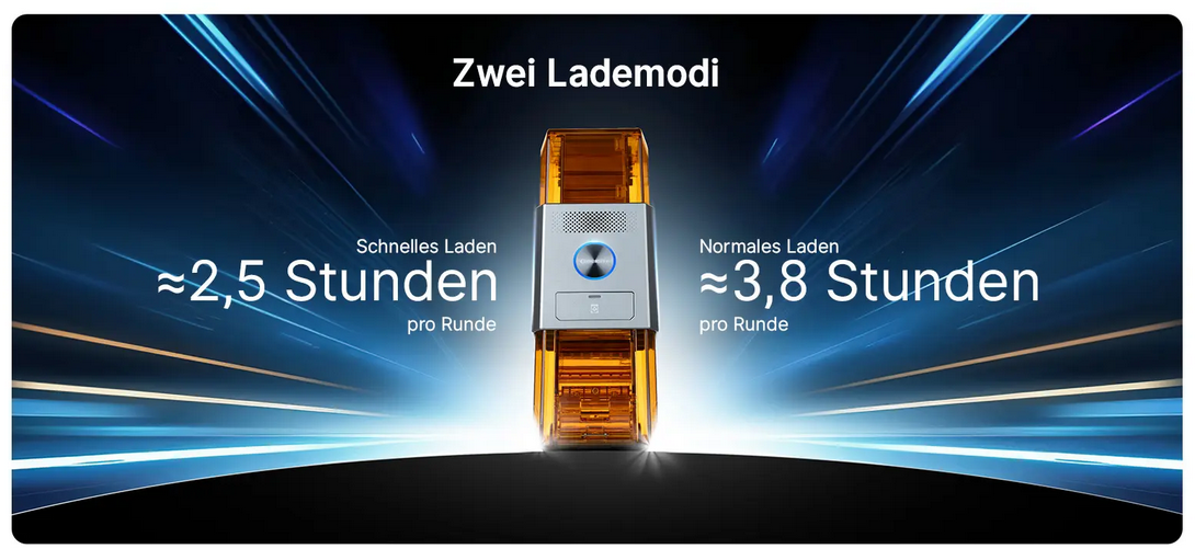 Mit der innovativen „Waterfall Charging“-Technologie können bis zu vier Batterien gleichzeitig in nur 2,5 Stunden vollständig aufgeladen werden. Die restlichen Akkus warten in der oberen Kammer und werden automatisch nachgeladen, sobald Platz frei wird.
