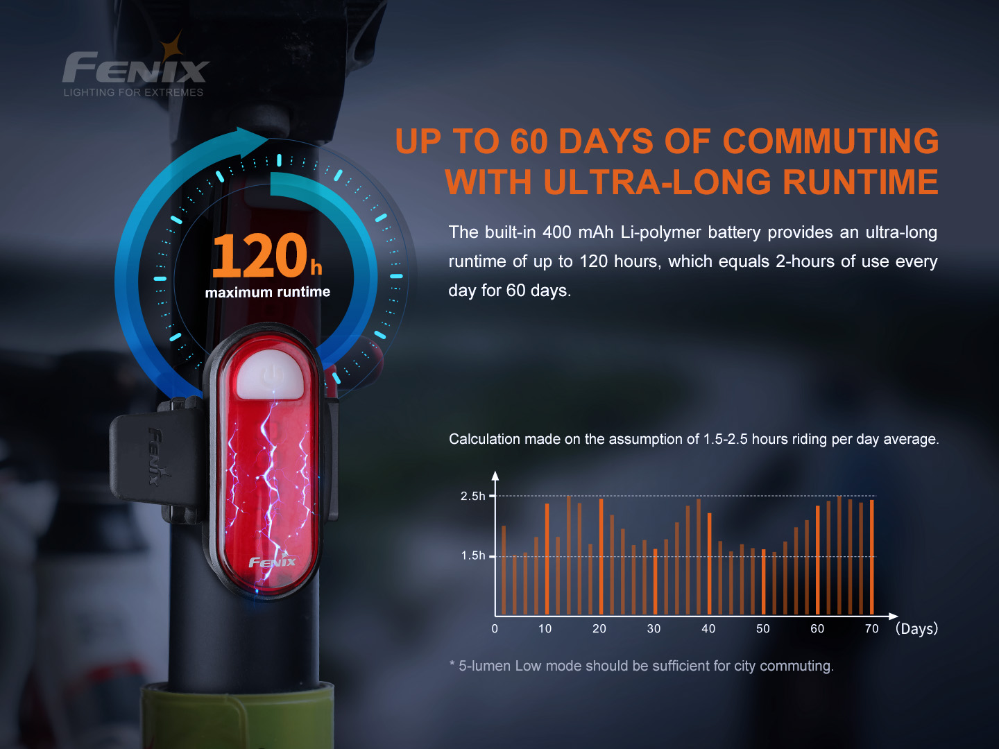 Das LED Fahrrad-Rücklicht BC05R V2.0 von Fenix schützt Sie perfekt im Strassenverkehr. Es leuchtet mit bis zu 15 Lumen und ist bis zu 230 Meter sichtbar. Der verbaute Lithium-Polymer-Akku sorgt für eine maximale Leuchtdauer von unfassbaren 120 Stunden und kann anschliessend ganz einfach mit dem mitgelieferten USB Typ C Kabel wieder aufgeladen werden. Die Akkuanzeige zeigt stets den verbleibenden Akkustand an. Dank dem einfachen Gummiriemen-System und dem mitgelieferten Körperclip kann das Rücklicht nahezu überall ganz schnell und einfach montiert werden. Die IP66 Authentifizierung macht das Licht zum perfekten Allwetter-Begleiter im Strassenverkehr.