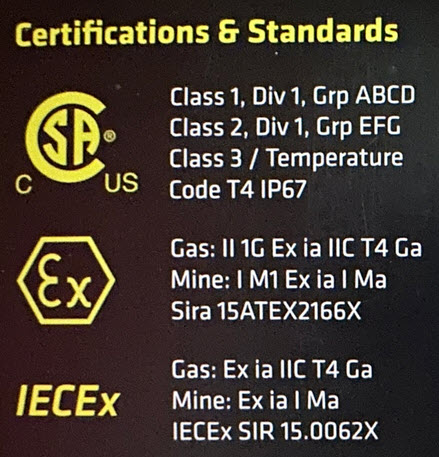 Gas: II 1G Ex ia IIC T4 Ga Mine: I M1 Ex ia I MA Sira 15ATEX2166X