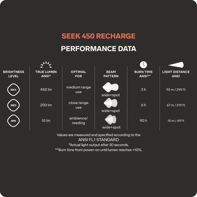 Mit 450 Lumen, mehreren Lichtmodi, einem Super-Low-Modus für besonders lange Leuchtdauer, rotem Licht zum Erhalt der Nachtsicht und einer Sperrfunktion für zusätzliche Sicherheit ist die Seek 450 Recharge ein vielseitiger Allrounder, auf den du dich jederzeit verlassen kannst.