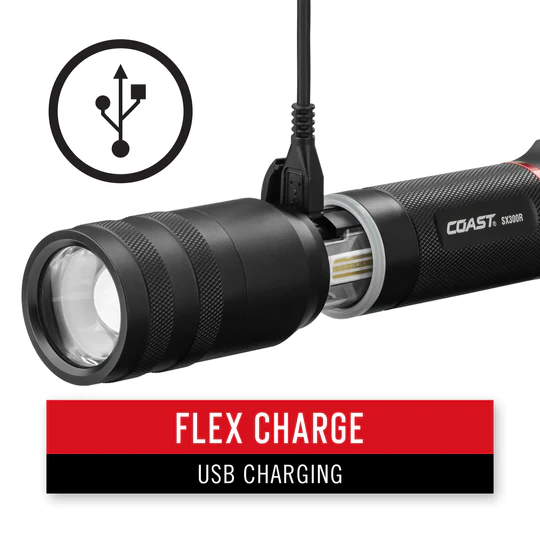 Schalten Sie zu Ihren Bedingungen ein. Leuchten mit COAST Flex Charge-Technologie verfügen über einen wiederaufladbaren Akku, der entweder innerhalb oder außerhalb der Leuchte aufgeladen werden kann. Ein einfacher USB-Anschluss an Wechsel- oder Gleichstrom sorgt dafür, dass Sie immer Saft haben.