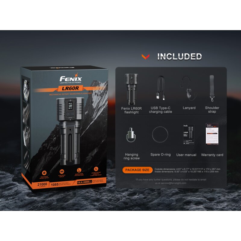 Die Fenix LR60R ist eine Hand-Suchtaschenlampe. Betrieben wird diese mit einem austauschbaren Akkupack, das aus 4 x 4000mAh Akkus besteht. Die Fenix LR60R hat eine erstaunliche maximale Leistung von 21.000 Lumen und eine maximale Leuchtweite von 1.085 Metern.