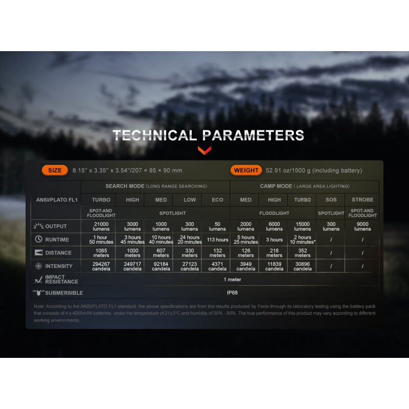 Hinweis: Gemäss der Norm ANSI/PLATO FL1 Standard sind die oben genannten Spezifikationen die Ergebnisse von Fenix Labortests mit einem Akkupack, bestehend aus 4 x 4000mAh Akkus, bei einer Temperatur von 21±3°C und einer Luftfeuchtigkeit von 50% - 80%. Die tatsächliche Leistung dieses Produkt kann je nach Arbeitsumgebung variieren.