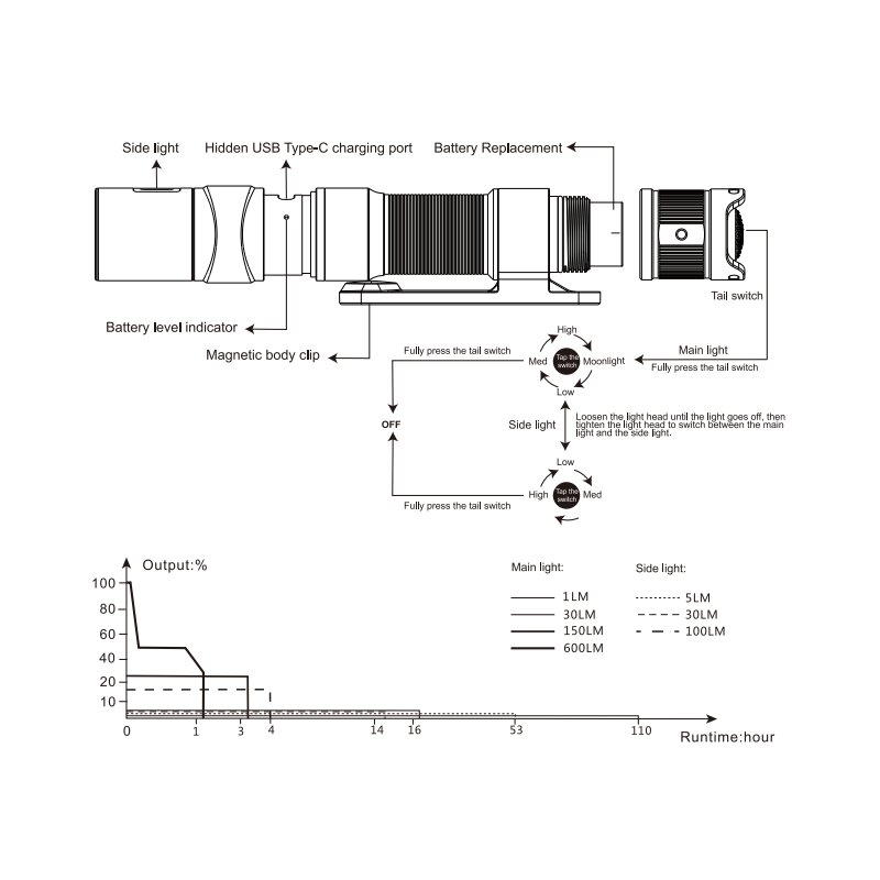 Die Hauptlampe ist mit einer kaltweissen LED ausgestattet und verfügt über vier Leuchtstufen. Die Seitenlampe liefert einen ausgewogenen und weicheren Lichtstrahl. Die Taschenlampe ist mit einen magnetischen Gehäuseclip ausgestattet und kann beispielsweise an einer Metalloberfläche in der Nähe befestigen werden, um die Hände frei zu haben. Weitere Merkmale sind ein versteckter Typ-C-Ladeanschluss und die Schutzart IP68.