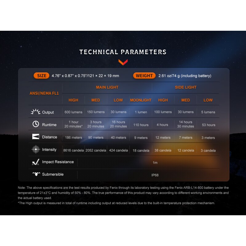 *= Hinweis: Die zuvor genannten Werte wurden im Labor bei 21±3°C und 50% - 80% Luftfeuchtigkeit unter der Verwendung des Fenix ARB-L14-800 LiIon Akku ermittelt und können zwischen Taschenlampe, Batterien / Akkus und Umgebung abweichen.
