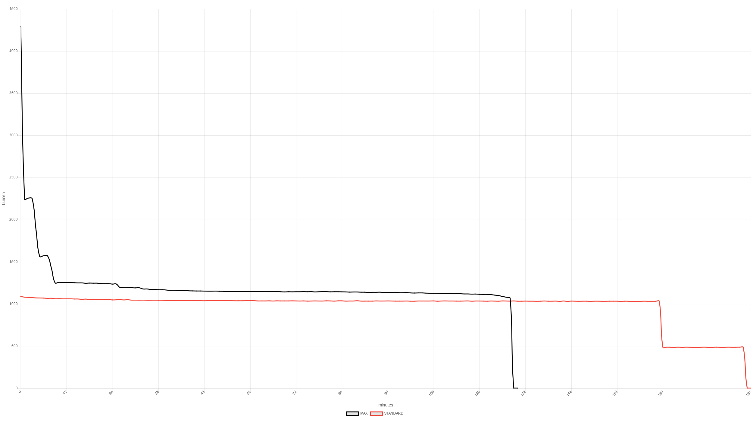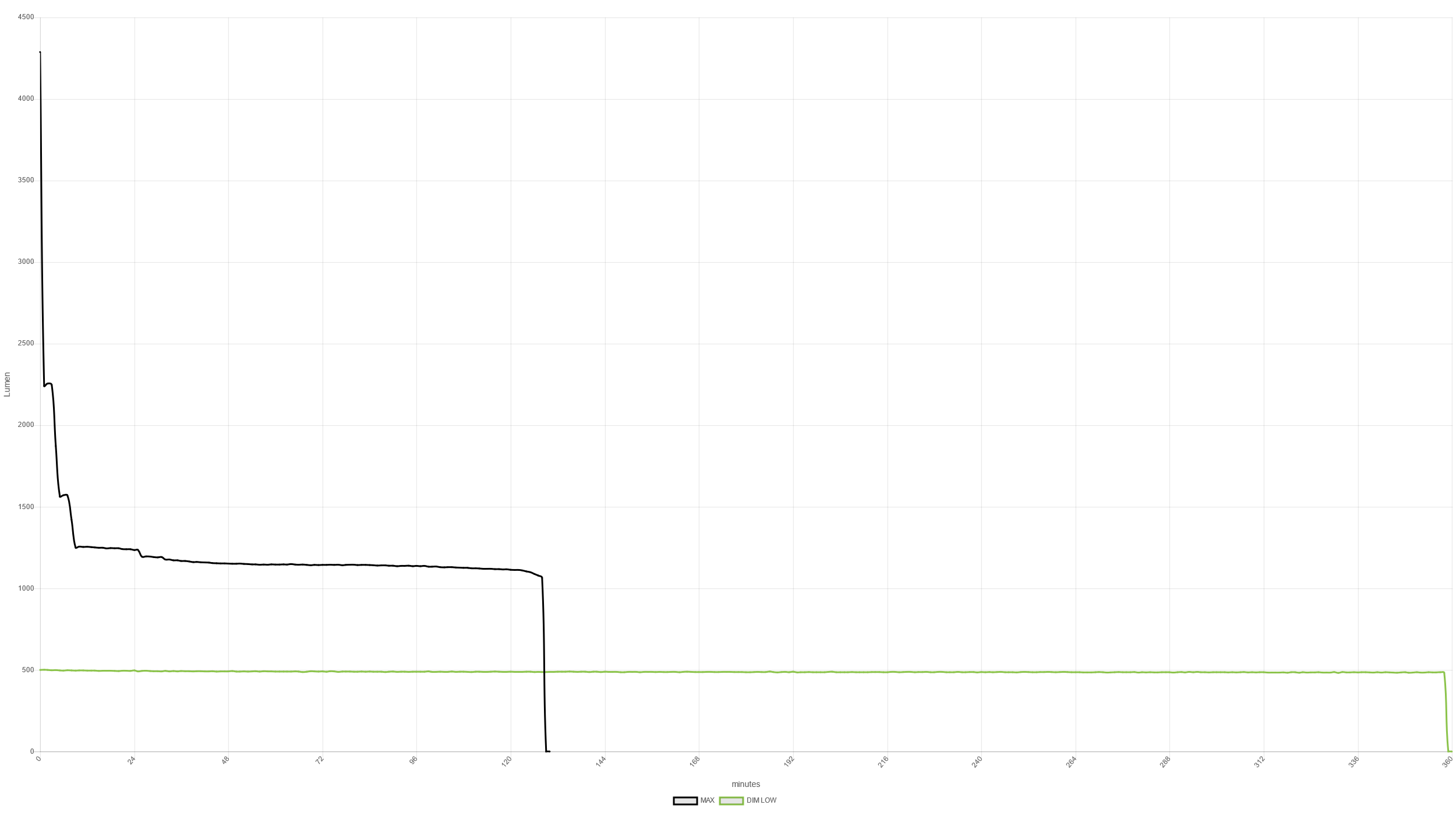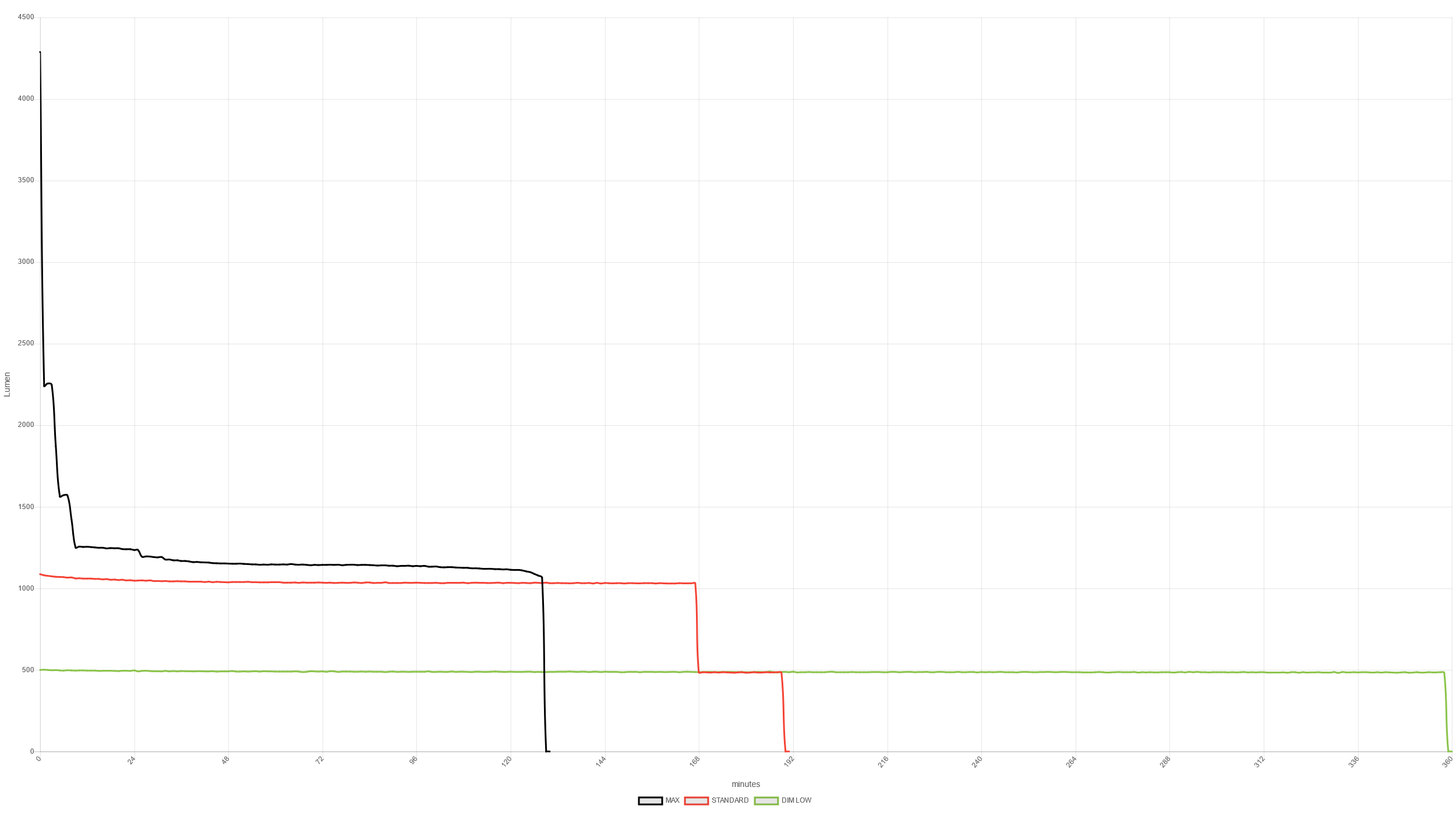 Lumen (Step mode): | Hoch: 4200 lm / Mittel: 1000 lm / Niedrig: 200 lm |
