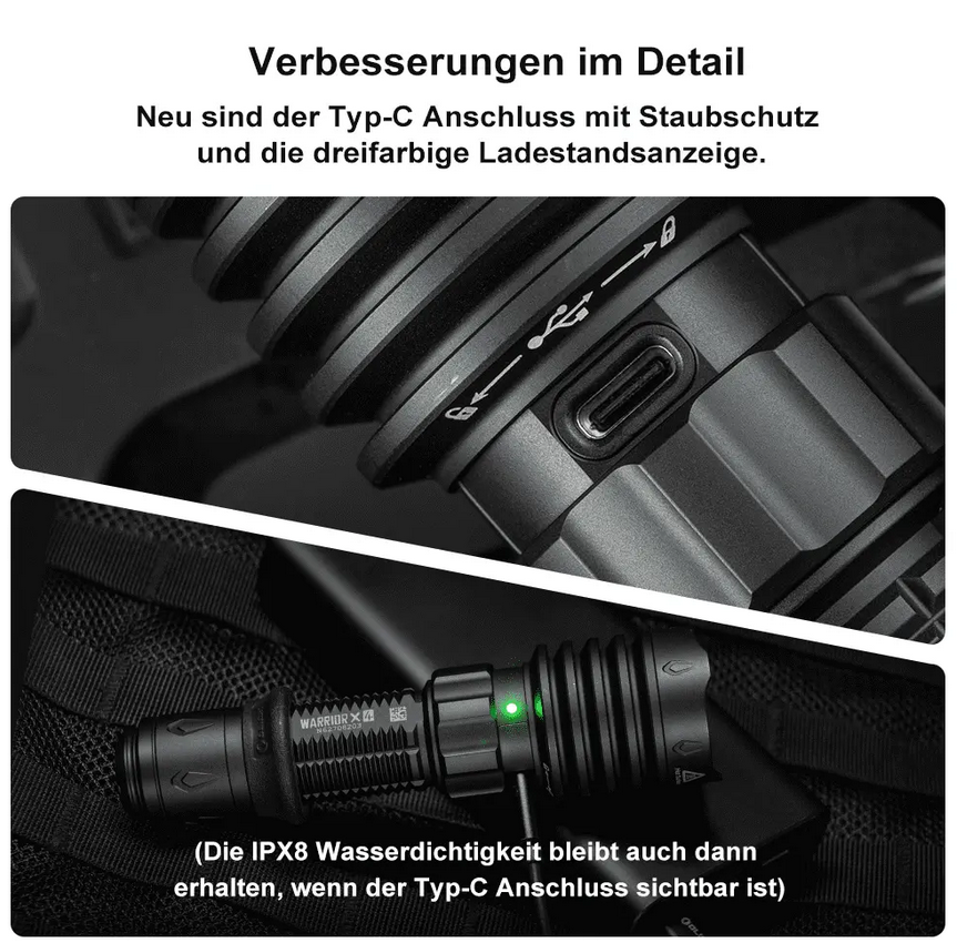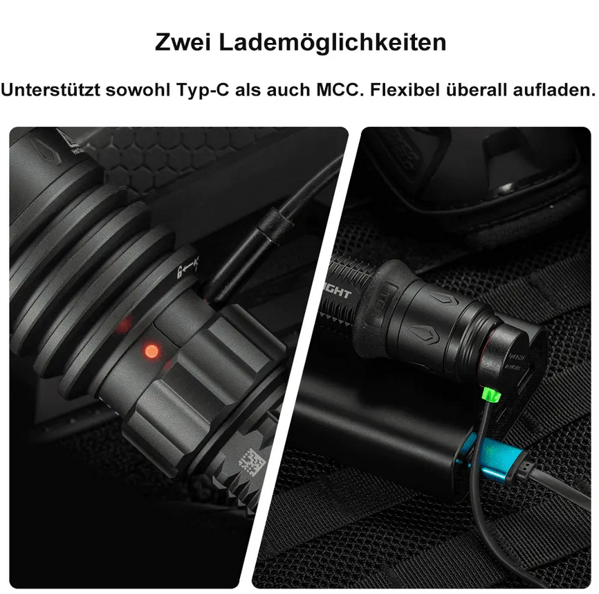 - Duale Ladeoptionen: Zusätzlich zum magnetischen Ladeanschluss der Endkappe bietet die Taschenlampe einen versteckten Typ-C Ladeanschluss