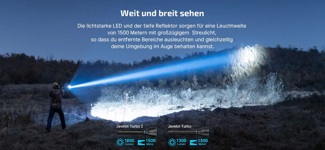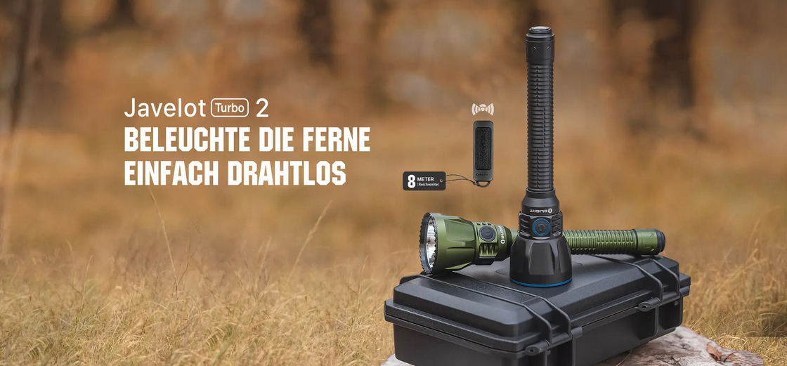Die Javelot Turbo 2 ist eine Taschenlampe mit großer Leuchtweite, die für die Jagd und Personensuche entwickelt wurde. Mit ihrer maximalen Leistung von 1800 Lumen erreicht sie eine Leuchtweite von bis zu 1500 Metern. Darüber hinaus kann die Lampe mit einer kabellosen Fernbedienung gekoppelt werden und so aus bis zu 8 Metern Entfernung bedient werden. Die magnetische Ladestation an der Taschenlampe bietet einen festen Aufbewahrungsort für die Fernbedienung und lädt sie gleichzeitig auf. Angetrieben von einem leicht wechselbaren 5000mAh Akkupack erreicht sie eine Laufzeit von bis zu 272 Stunden. Mit USB-C und der magnetischen Ladefunktionen bietet die Taschenlampe aussergewöhnliche Ladeflexibilität. Sie kann ausserdem für die Jagd mit der Magnethalterung X-WM03 an einem Setup montiert werden. Ob dort, bei der Suche nach einer vermissten Person oder bei der Kontrolle eines Hinterhofs – die Javelot Turbo 2 ist genau die richtige Lösung für dich.