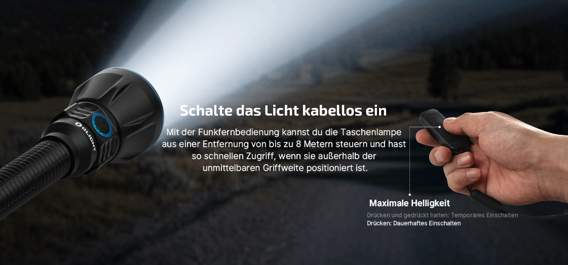 - Praktische kabellose Fernbedienung: Nach der Kopplung mit der Taschenlampe ermöglicht die Fernbedienung die Bedienung aus einer Entfernung von bis zu 8 Metern. Sie wird mit der magnetischen Ladestation sicher an ihrem Platz gehalten und direkt an der Taschenlampe aufgeladen