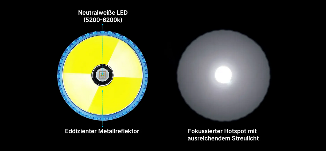- Unübertroffene Ausleuchtung über grosse Entfernungen: Die eistungsstarke LED und der tiefe Reflektor liefern 1800 Lumen mit einer leuchtweite von 1500 Metern im Turbomodus