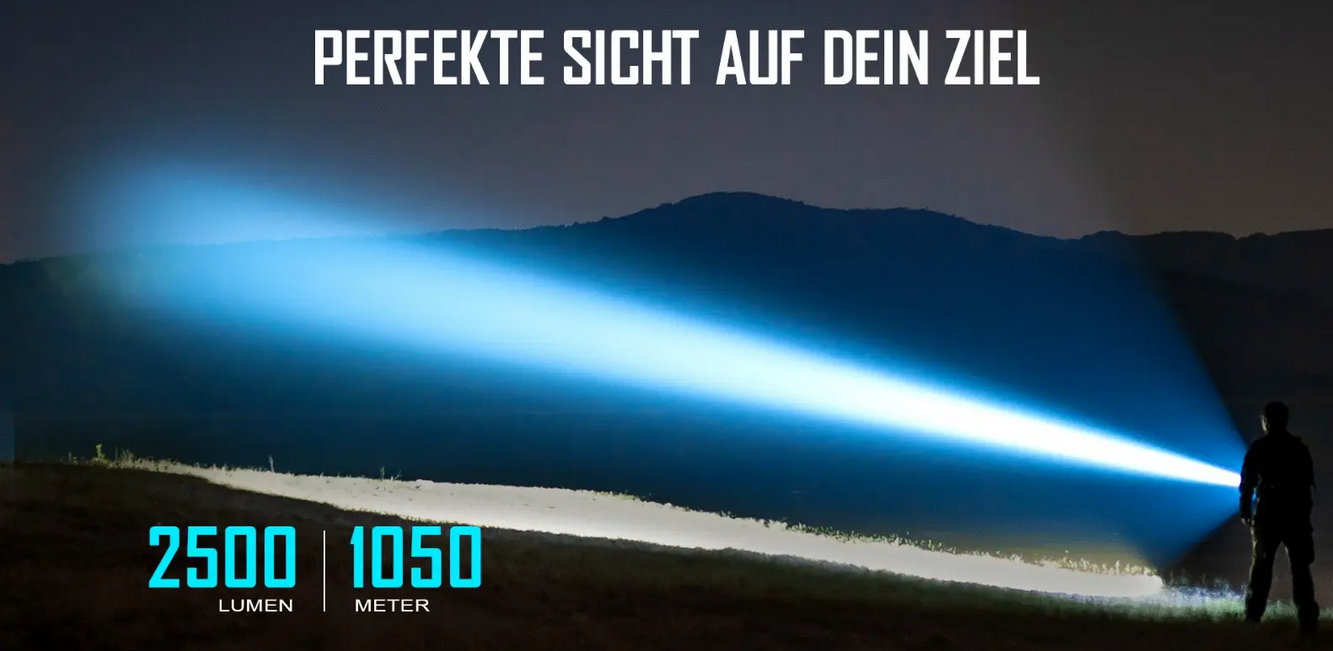 - Heller und weit reichender Lichtstrahl: Die tief im Reflektor sitzende Hochleistungs-LED produziert bis zu 2500 Lumen bei einer Leuchtweite von 1050 Metern