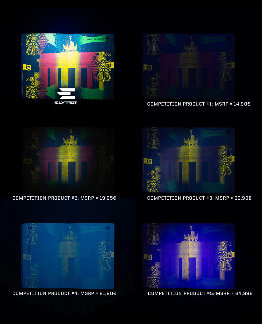 Die integrierte UV-LED mit 3 Watt Leistung und einer Wellenlänge von 365 nm macht es möglich, Sicherheitsmerkmale auf Ausweisen, Geldscheinen und offiziellen Dokumenten zuverlässig sichtbar zu machen – ein unverzichtbares Werkzeug im Bereich Sicherheits- und Dokumentenprüfung.