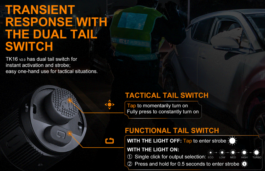 Die TK16 V2.0 verfügt über einen intuitiven Doppelschalter auf der Rückseite, mit dem sich die verschiedenen Leuchtmodi einfach aktivieren lassen.