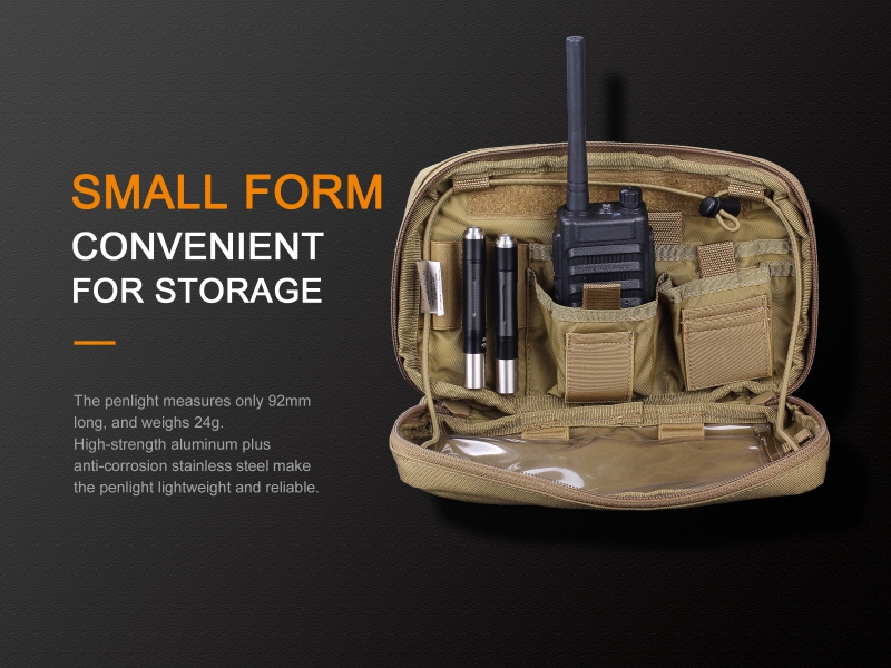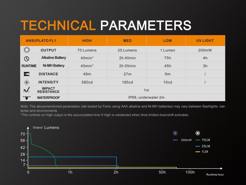 Die LD05 V2.0 von Fenix ist eine super kompakte und leistungsfähige Stifttaschenlampe, die sowohl in warmweissem Licht und UV-Licht leuchten kann. Die verbaute Cree XQ-E HI LED strahlt in 3 verschiedenen Helligkeitsstufen und sorgt so für maximal 70 Lumen bei einer Leuchtweite von 48 Meter. Die verbaute 365 nm UV LED schafft 200mW UV-Licht. Betrieben wird die LD05 V2.0 von einer AAA-Batterie, welche im 1-Lumen-Modus bis zu 75 Stunden hält. Dank der einfachen Bedienung mit dem Edelstahl-Endschalter lässt sich die Lampe gar einhändig benutzen. Zudem ist die Fenix LD02 V2.0 bis zu 2 Meter wasserdicht (IP68) und somit perfekt geeignet für Ihr nächstes Abenteuer.