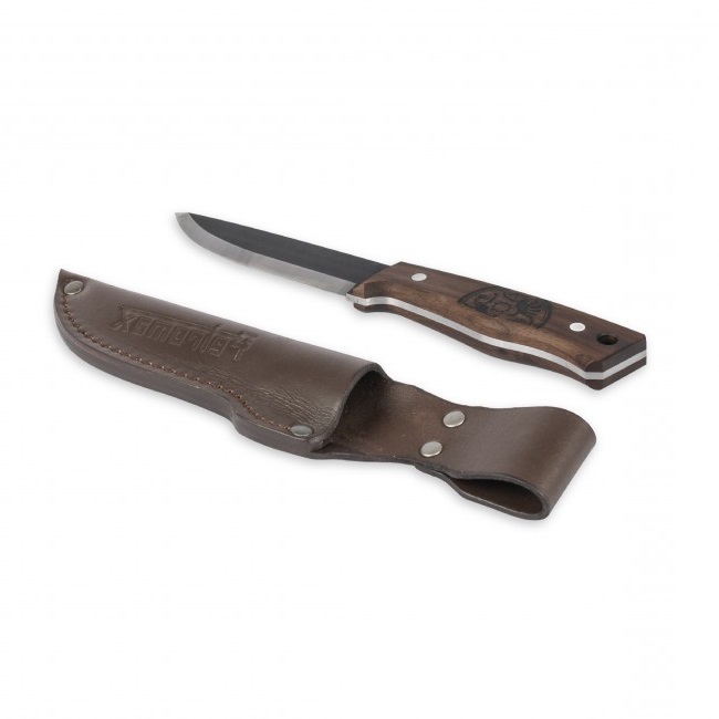 Material: Klinge: Stahl 1.2235 (80 CrV2) / Griff: Wallnussholz / Nieten: Aluminium / Transporttasche: Echtleder