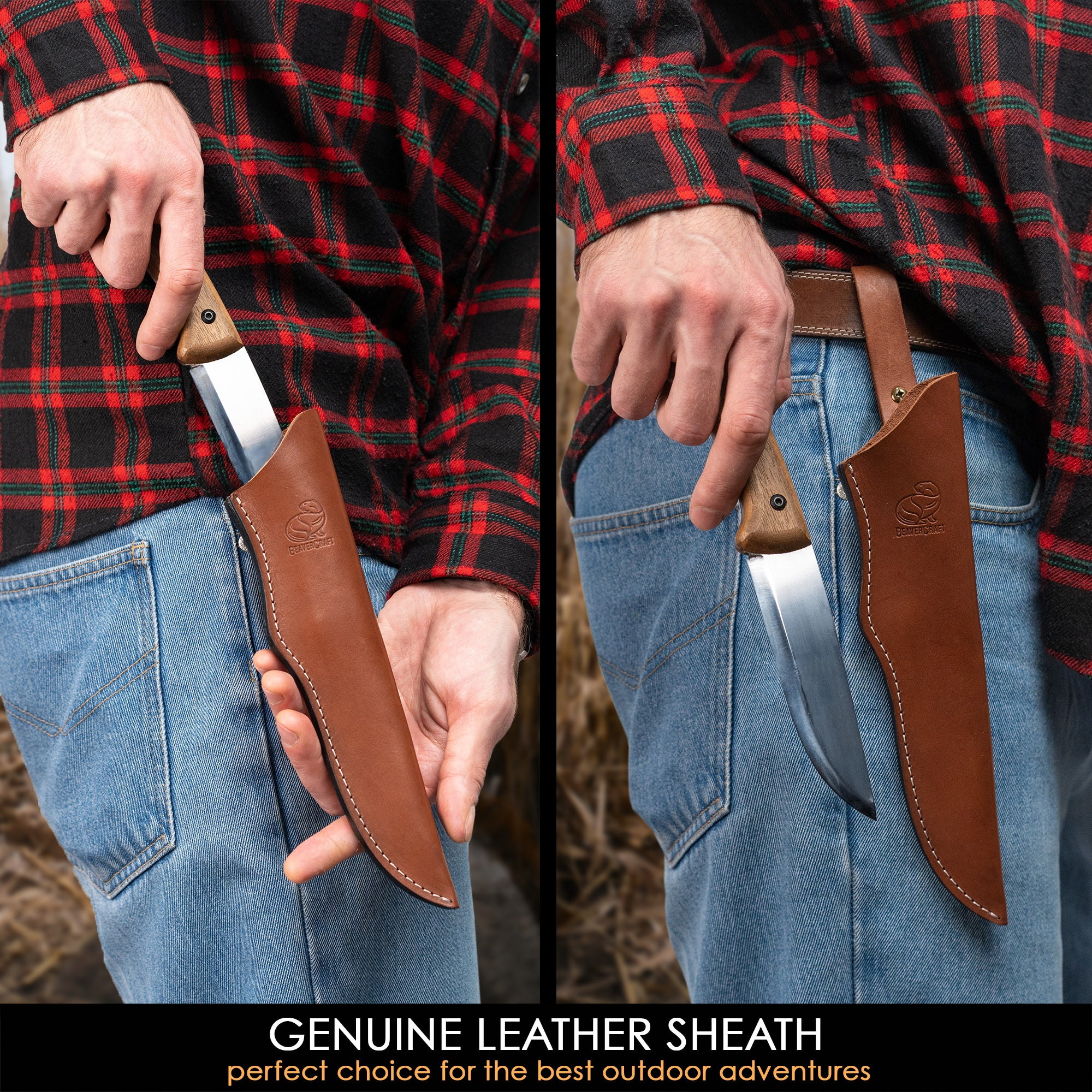 Das Messer hat ein elegantes Griffdesign mit einem robusten Look. Es ist ergonomisch und rutschfest und sorgt für optimale Präzision bei der Anwendung (Hände ermüden auch nach langen Bushcraft-Arbeiten nicht). Zum einfachen und sicheren Tragen beim Jagen, Angeln oder langen Wanderungen, ist eine Echtlederscheide im Lieferumfang enthalten.