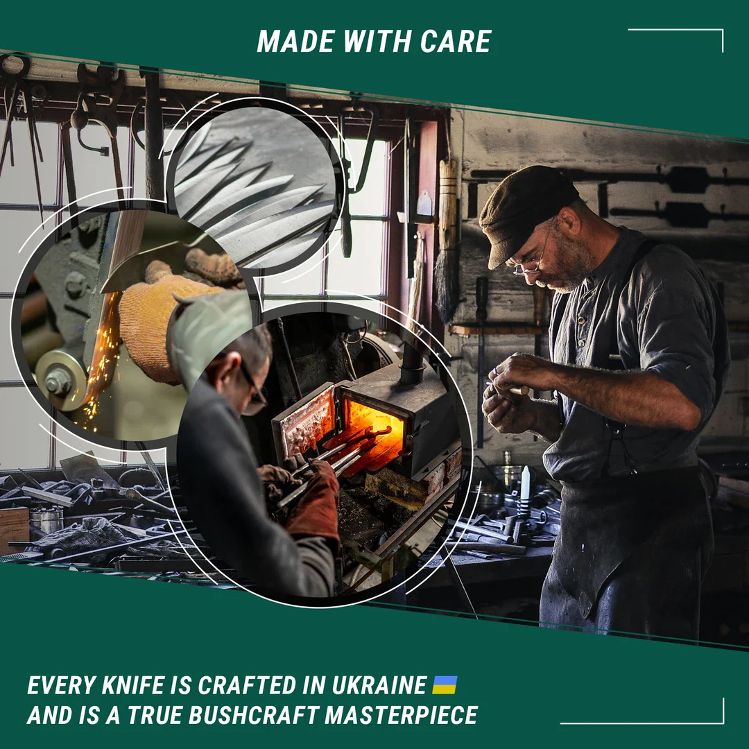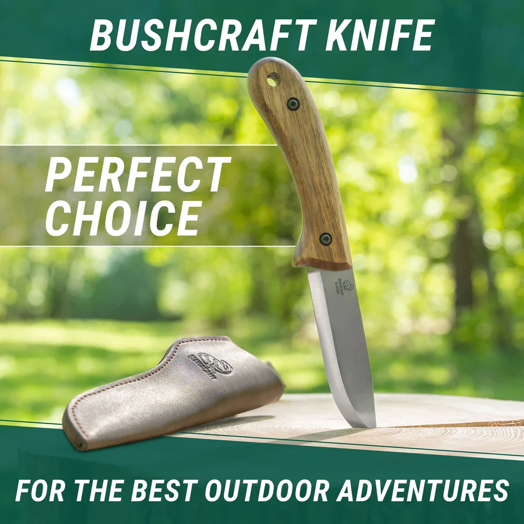 Dieses exakte Bushcraft-Überlebensmesser mit feststehender Klinge hat die richtige Geometrie und ein ergonomisches Design. Es ist bequem, funktionell und einfach zu bedienen (die Hände, werden auch nach langen Arbeitsstunden nicht müde). Das Messer verfügt über eine kleinere, aber beeindruckende Rasierklinge aus Kohlenstoffstahl, die auch für Kinder von großem Nutzen sein wird, und in jedem Bereich, den du vorstellen kannst – es eignet sich als Tranchiermesser, Kochmesser und viele weitere Zwecke. Es hat einen Griff aus Walnussholz mit einer Lederschnur, der angenehm und leicht zu halten ist.