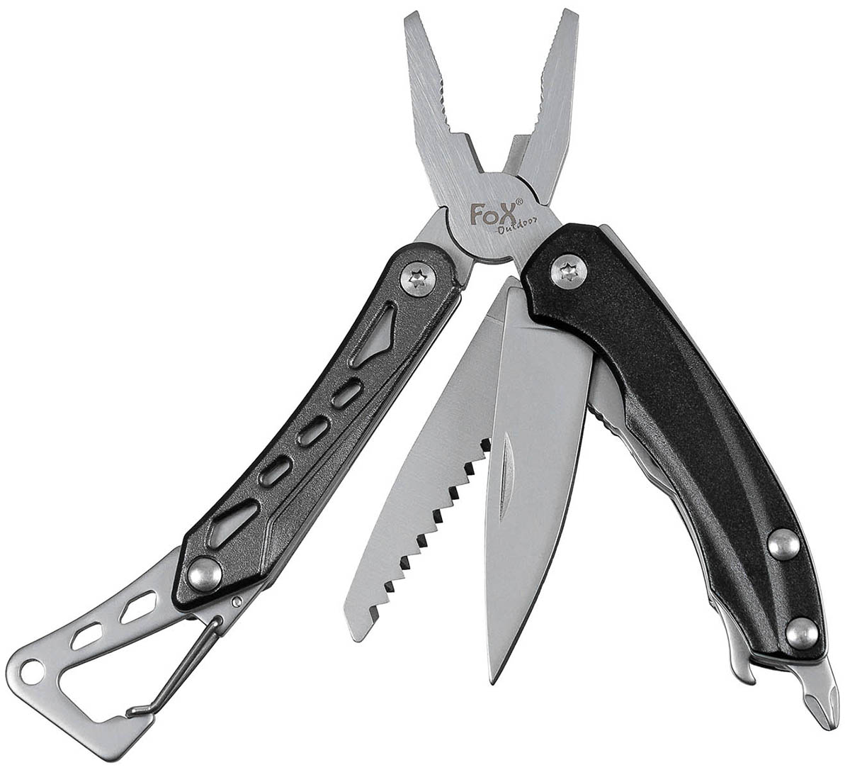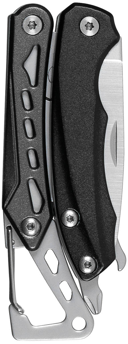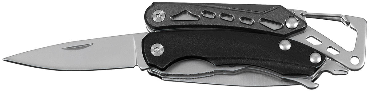 4-teiliges Multifunktionstool mit Karabiner Messer mit ca. 5 cm Klinge Säge, doppelt gezahnt Kombizange mit Seitenschneider Kreuzschraubendreher mit Flaschenöffner Masse geschlossen: ca. 8,5 x 3 x 1,5 cm Gewicht: ca. 100 g