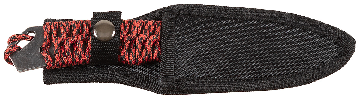 Klinge aus 3Cr13 Stahl stonewashed mit Glattschliff mit einseitiger Hohlkehle und Fingerschutz Griff mit schwarz/rotem Nylonband umwickelt schwarze Polyesterscheide mit Gürtelschlaufe und Druckknopf Gesamtlänge: ca. 23 cm Klinge: ca. 10,5 cm Klingenstärke: ca. 3,7 mm Gewicht Messer: ca. 150 g Gewicht mit Scheide: ca. 200 g