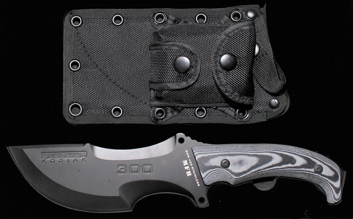 geschwärzte, gebogene Klinge mit Glattschliff mit Fingerschutz und 2 Befestigungsösen Micarta-Griff ergonomisch geformt mit Glasbrecher und Befestigungsöse mehrfach genietete Nylonscheide mit Druckknöpfen mit Gürtelschlaufe quer und längs tragbar abnehmbare Tasche mit Druckknopf, Schleifstein und Feuerstarter Klingenstärke: ca. 6 mm, Stahl 420 Gesamtänge: ca. 30 cm Klinge: ca. 17 cm Gewicht Messer: ca. 540 g Gewicht mit Scheide: ca. 740 g