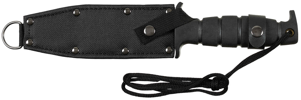 Air Force SP2-95 geschwärzte Klinge aus 3Cr13 Stahl mit Glattschliff und Sägerücken und beidseitiger Hohlkehle 2-schneidige Messerspitze gerillter Gummigriff mit Handschutz und Befestigungsöse Polyester-/Lederscheide mit Druckknöpfen und Gürtelschlaufe Gesamtlänge: ca. 27 cm Klinge: ca. 13,5 cm Klingenstärke: ca. 4,7 mm Gewicht Messer: ca. 260 g Gewicht mit Scheide: ca. 330 g