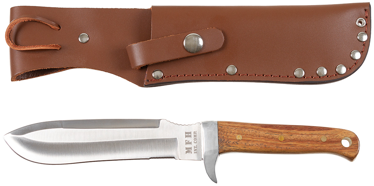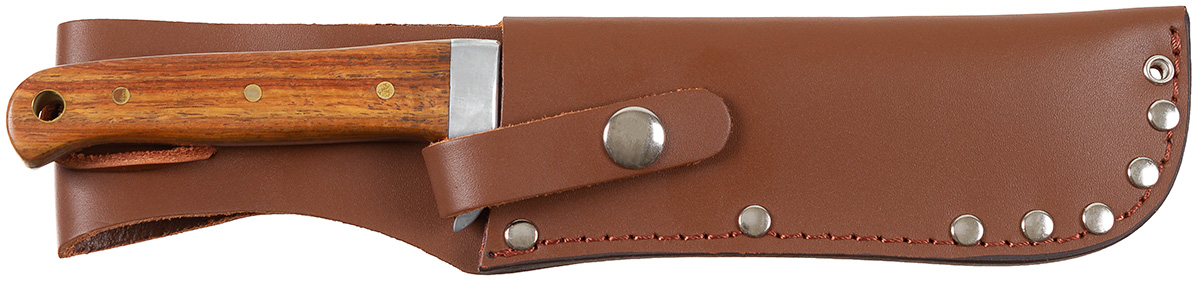 Klinge aus 3Cr13 Stahl mit Glattschliff und partieller, kurzer Sägezahnung gerillte Daumenauflage oben Fingerschutz unten genietete Holzgriffschalen (Holzmaserung und -farbe kann abweichen!) und Befestigungsöse mehrfach genietete Lederscheide zusätzlich vernäht mit verstellbarer Schlaufe und Sicherungsriemen mit Druckknopf sowie Gürtelschlaufe Gesamtlänge: ca. 27,5 cm Klinge: ca. 15,5 cm Klingenstärke: ca. 4,8 mm Gewicht Messer: ca. 275 g Gewicht mit Scheide: ca. 360 g