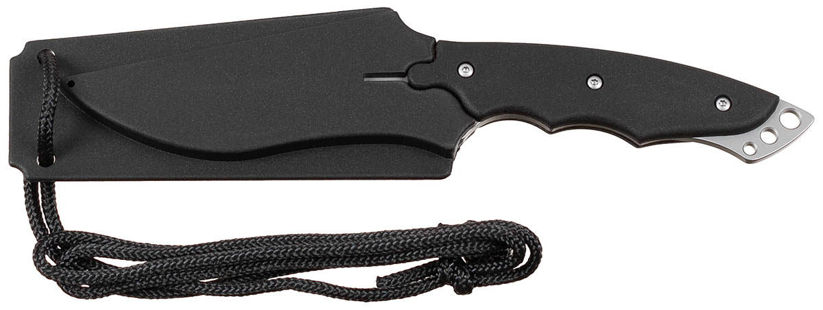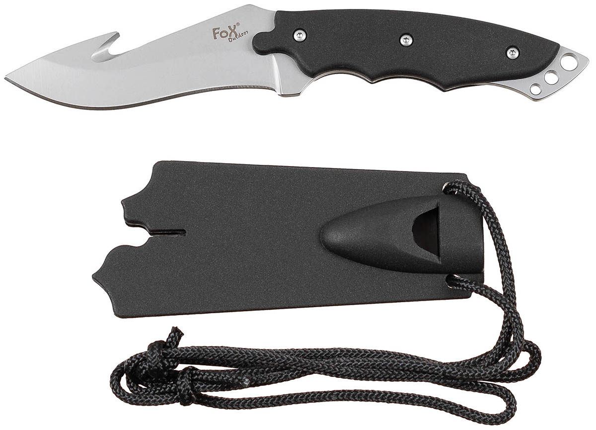 gebogene Klinge aus 3Cr13 Stahl mit Glattschliff, Gurtschneider und Daumenauflage ergonomisch geformte ABS-Kunststoffgriffschalen 3 Befestigungsösen am Griffende Kunststoffscheide mit integrierter Signalpfeife und Nackenband Gesamtlänge: ca. 18 cm Klinge: ca. 8,3 cm Klingenstärke: ca. 2,6 mm Gewicht Messer: ca. 80 g Gewicht mit Scheide: ca. 190 g