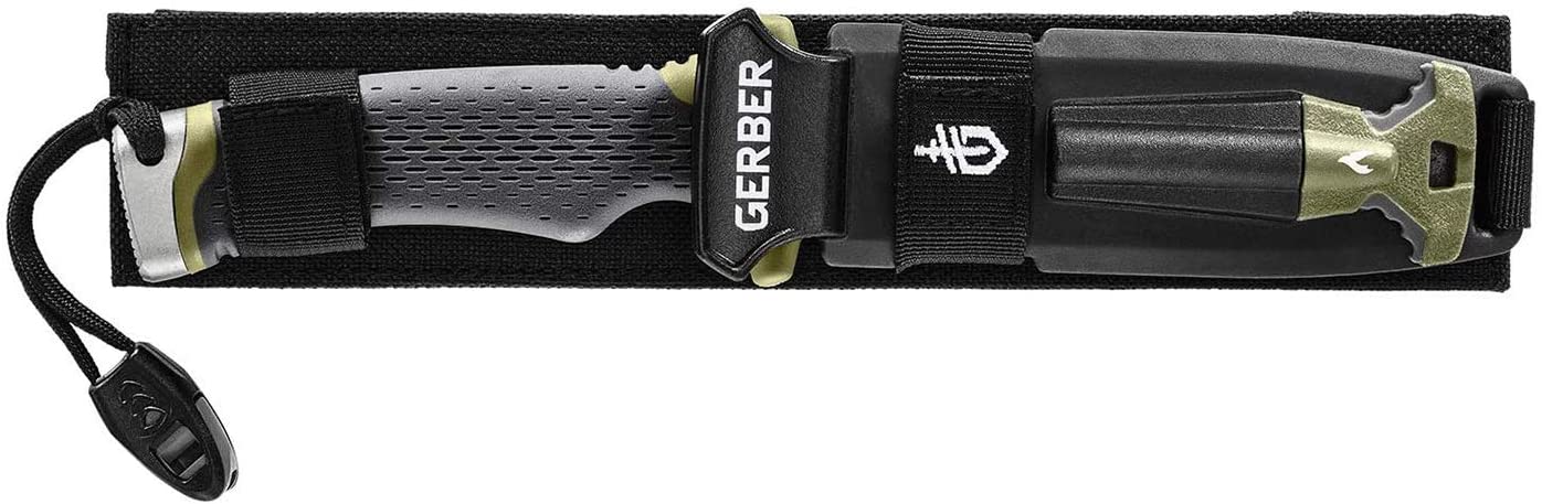 Lieferumfang: 1 x Gerber Ultimate Survival Fixed Messer, 1 x Holster, 1 x Diamantschärfer (integriert in Scheide), 1 x Feuerstarter, 1 x Signalpfeife