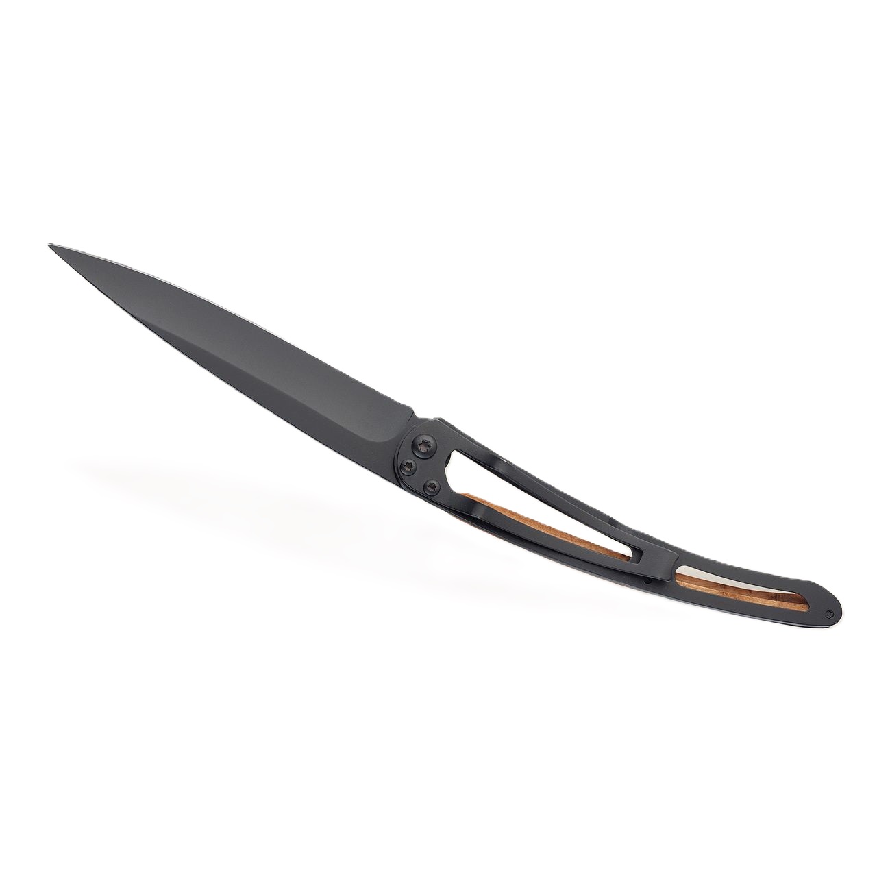 Ultraleichtes Messer aus Z40C13 Edelstahl mit schwarzer Oberfläche. Klinge mit ‚Liner-Lock‘ Sicherheitssperre dekoriert mit einer feinen Lasergravur. Gürtelclip. Griff aus Wacholderholz.