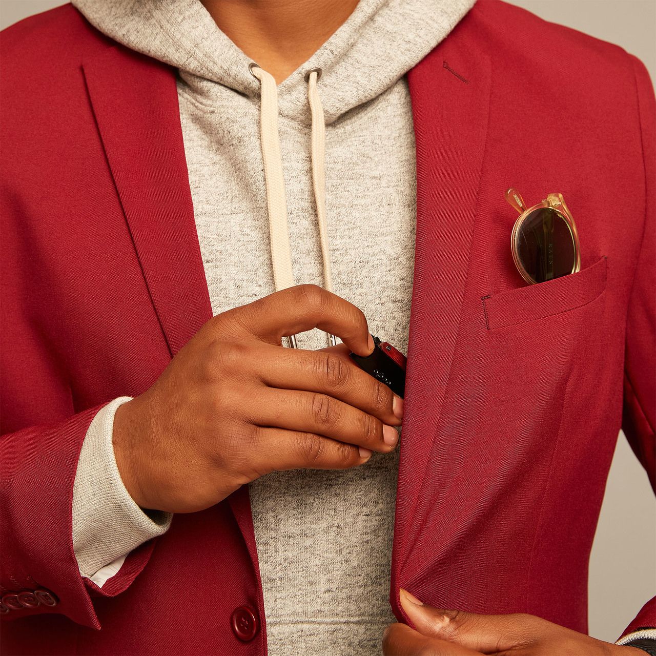 Ein Augenschmaus. Geometrische Asymmetrien, akzentuiert mit einem roten Aluminiumgriff, so schick wie das Messer selbst.