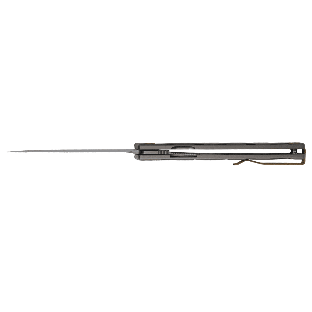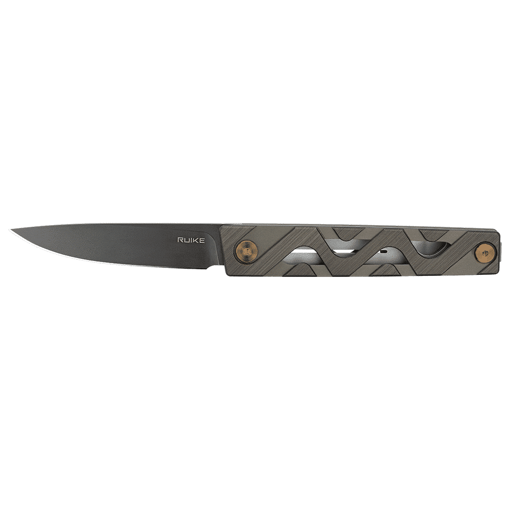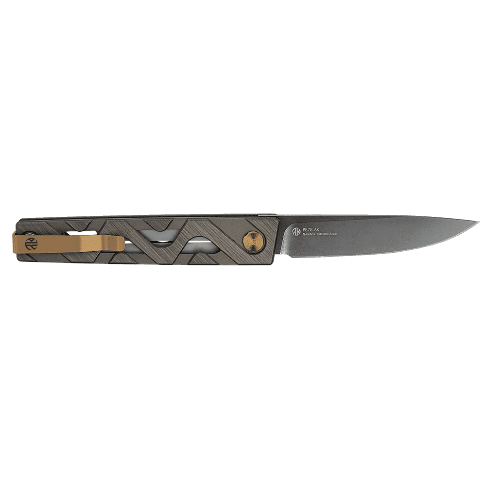 Das P875-AK fällt sofort durch seinen zweifarbigen Griff auf, der schwarze G10-Schalen mit Einsätzen aus kupferfarbener Titanlegierung kombiniert. Dieser optische Kontrast verleiht dem Messer ein elegantes Aussehen und sorgt gleichzeitig für eine außergewöhnliche Widerstandsfähigkeit gegen Stöße, Korrosion und Verschleiß.