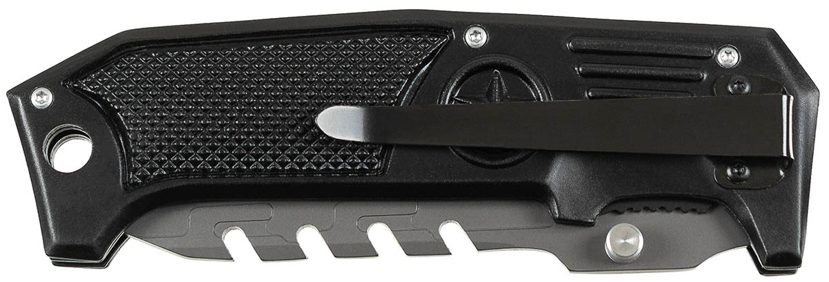 Klinge mit Glattschliff, oben gezackt, beidseitiger Daumen-Pin Liner-Lock Arretierung strukturierter Metallgriff mit Metallgürtelclip und Befestigungsöse ergonomisch geformt Gesamtlänge: ca. 23,5 cm Klinge: ca. 10,3 cm Klingenstärke: ca. 3,7 mm Gewicht: ca. 220 g