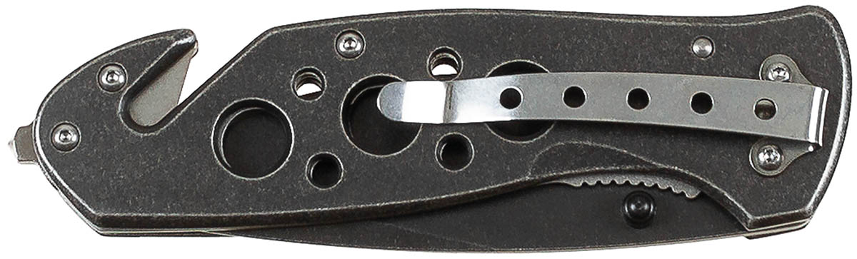 stonewashed Klinge mit Glattschliff und beidseitigem Daumen-Pin Liner-Lock Arretierung gelochter Metallgriff mit Gurtschneider und Glasbrecher ergonomisch geformt Metallgürtelclip Gesamtlänge: ca. 20,5 cm Klinge: ca. 8,5 cm Klingenstärke: ca. 2,9 mm Gewicht: ca. 180 g