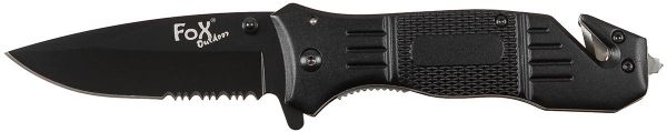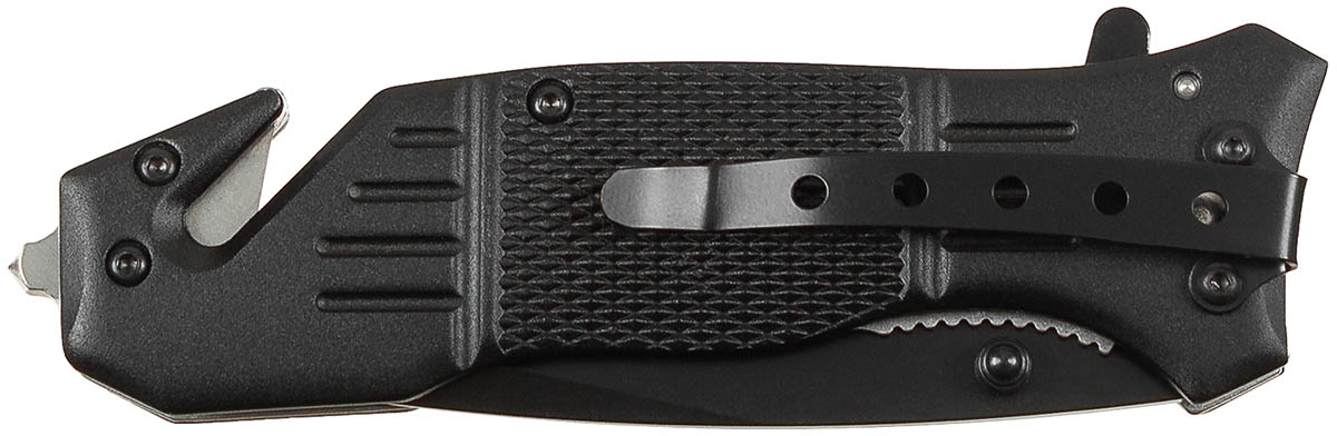 geschwärzte Klinge mit partiellem Wellenschliff, beidseitigem Daumen-Pin und Flipper-Öffnungshilfe Liner-Lock Arretierung strukturierter Metallgriff mit Gurtschneider und Glasbrecher ergonomisch geformt Metallgürtelclip Gesamtlänge: ca. 20,5 cm Klinge: ca. 8,5 cm Klingenstärke: ca. 2,9 mm Gewicht: ca. 150 g