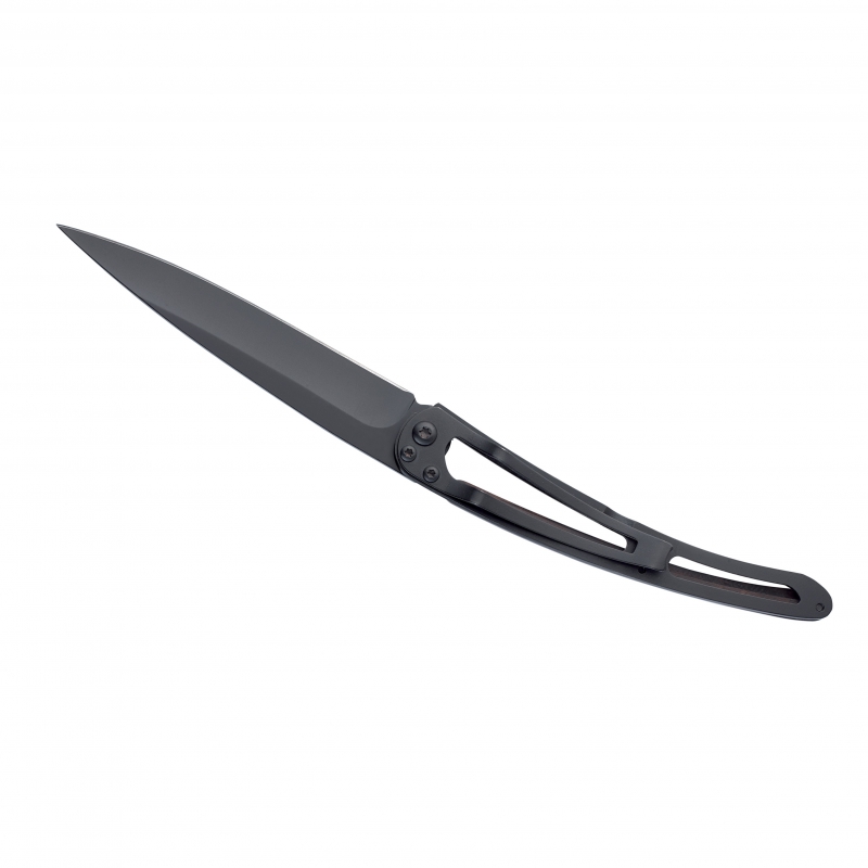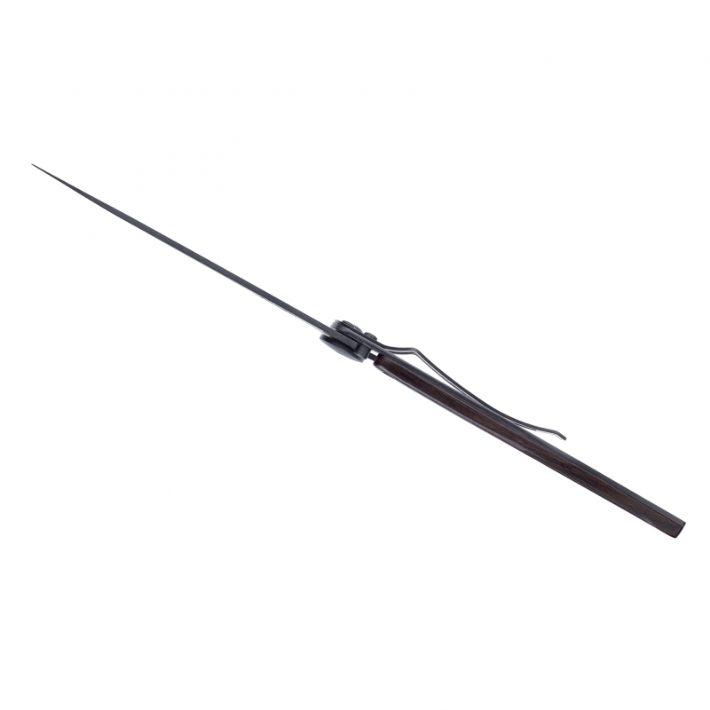 Ultraleichtes Messer aus 420er Edelstahl mit schwarzer Oberfläche. Klinge mit ‚Liner-Lock‘ Sicherheitssperre. Gürtelclip. Der Griff ist mit Grenadill-Holz besetzt. Grenadill-Holz ist ein tief dunkelbraunes bis fast schwarzes Hartholz der Palisander-Familie mit feiner schwarz-violetter Zeichnung. Grenadill ist sehr resistent gegen Feuchtigkeit. Es ist sehr fein und homogen strukturiert und fühlt sich glatt und etwas ölig an. Generell findet diese Holzart vor allem im Holzblasinstrumentenbau ihre Anwendung.