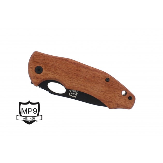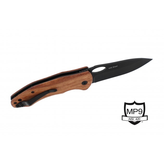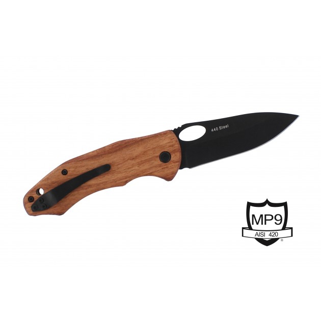 Einhandmesser mit schwarzer 440er Stahl-Klinge und Griffschalen aus Padaukholz. Gewicht: 117g Klingenstahl: 440er Stahl Klingenlänge: 9,7 cm Gesamtlänge: 20 cm Griffmaterial: Padauk