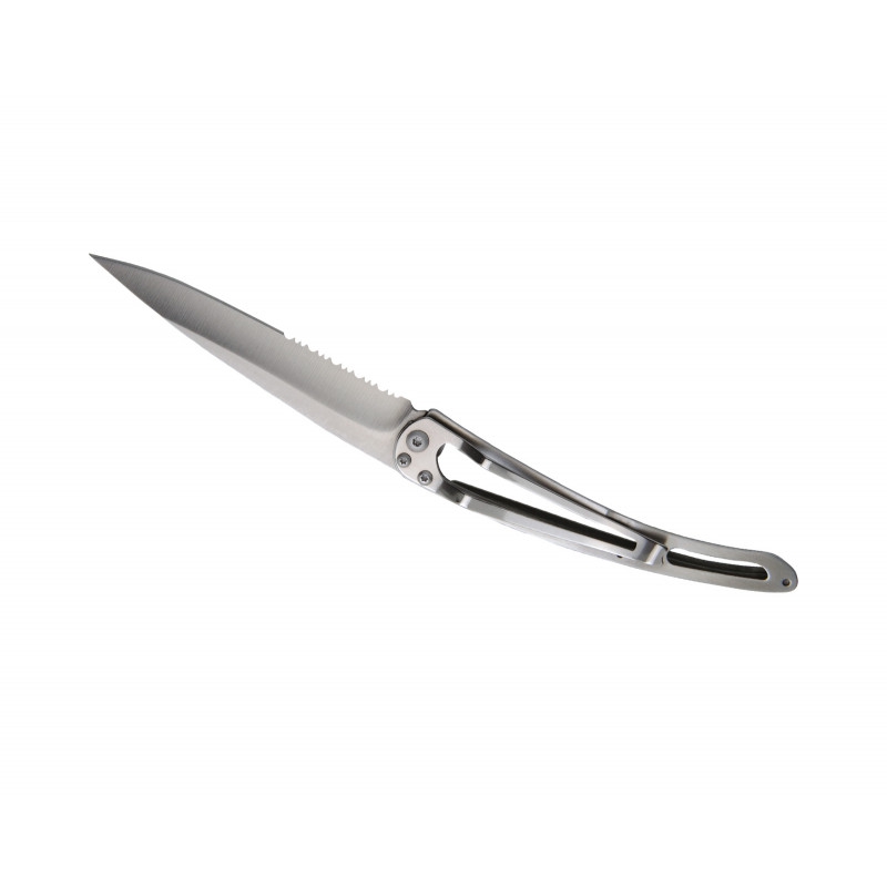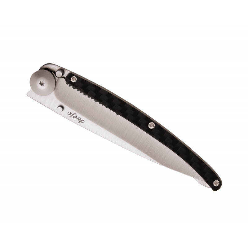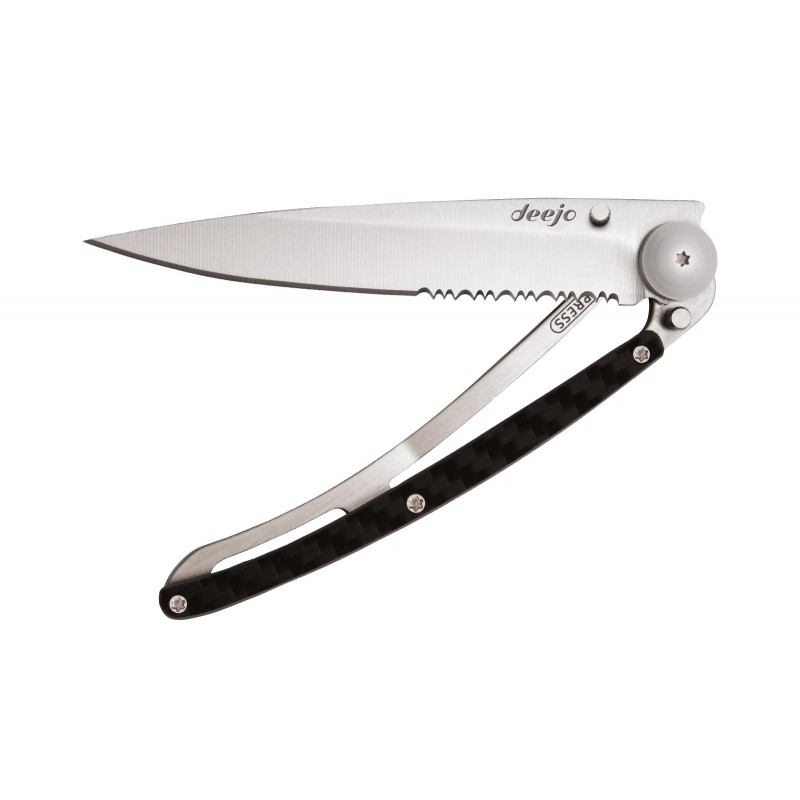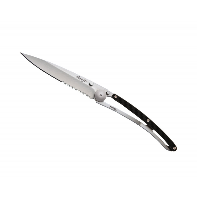 Ultraleichtes Messer aus 420er Edelstahl mit matter Oberfläche. Halbseitig gezahnte Klinge mit ‚Liner-Lock‘ Sicherheitssperre. Öffnen/Schließen mit einer Hand. Gürtelclip. Der Griff ist mit Kohlefaser besetzt.Gekennzeichnet durch seine geringe Dichte, hohe Zug- und Druckfestigkeit und eine ausgezeichnete chemische Inertheit wird Kohlefaser auch für seine ästhetischen Eigenschaften geschätzt. Dies macht es natürlich zu einem idealen Material für unsere schönsten Deejo.