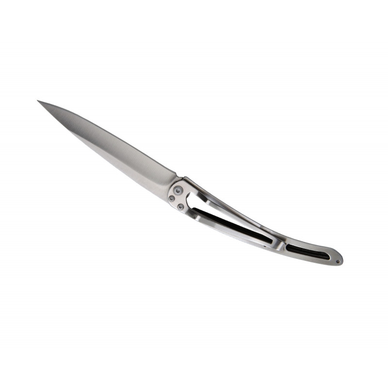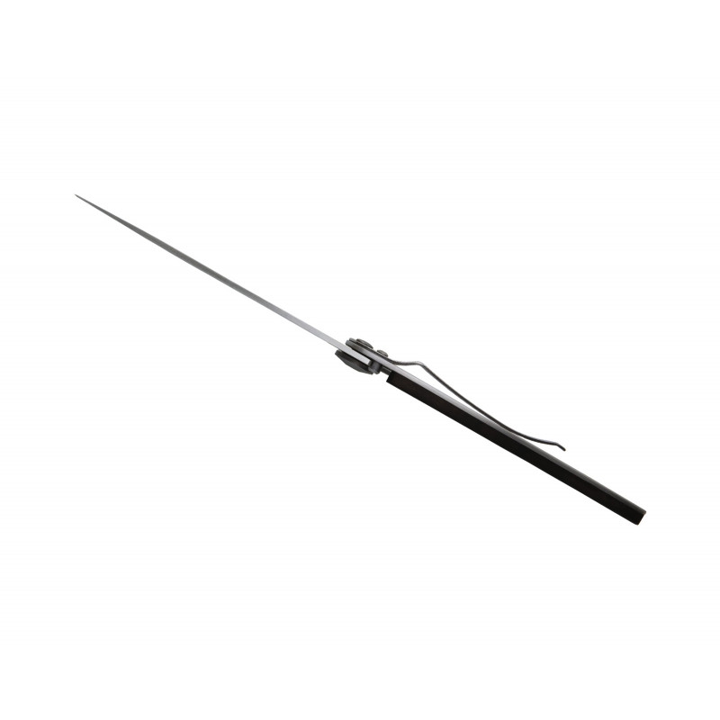 Ultraleichtes Messer aus 420er Edelstahl mit matter Oberfläche. Klinge mit ‚Liner-Lock‘ Sicherheitssperre dekoriert mit einer feinen Lasergravur. Gürtelclip.Der Griff ist mit Ebenholz besetzt. Das Ebenholz, das für seine tiefen Schwarztöne geschätzt wird, hat die Besonderheit, praktisch unempfindlich gegen Feuchtigkeit zu sein. Dieses ist eine dichte, widerstandsfähige und wertvolle Holzart, ideal für dieses schöne Messer.