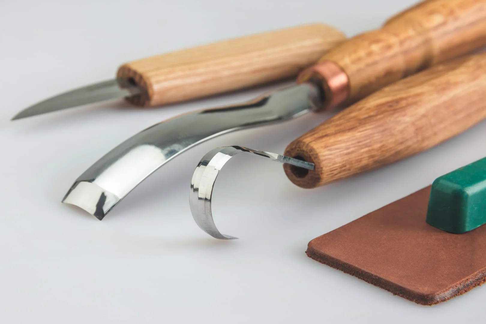 - Das Set enthält einen langen, gebogenen Hohleisen, ein Löffelschnitzmesser und ein Schnitzmesser