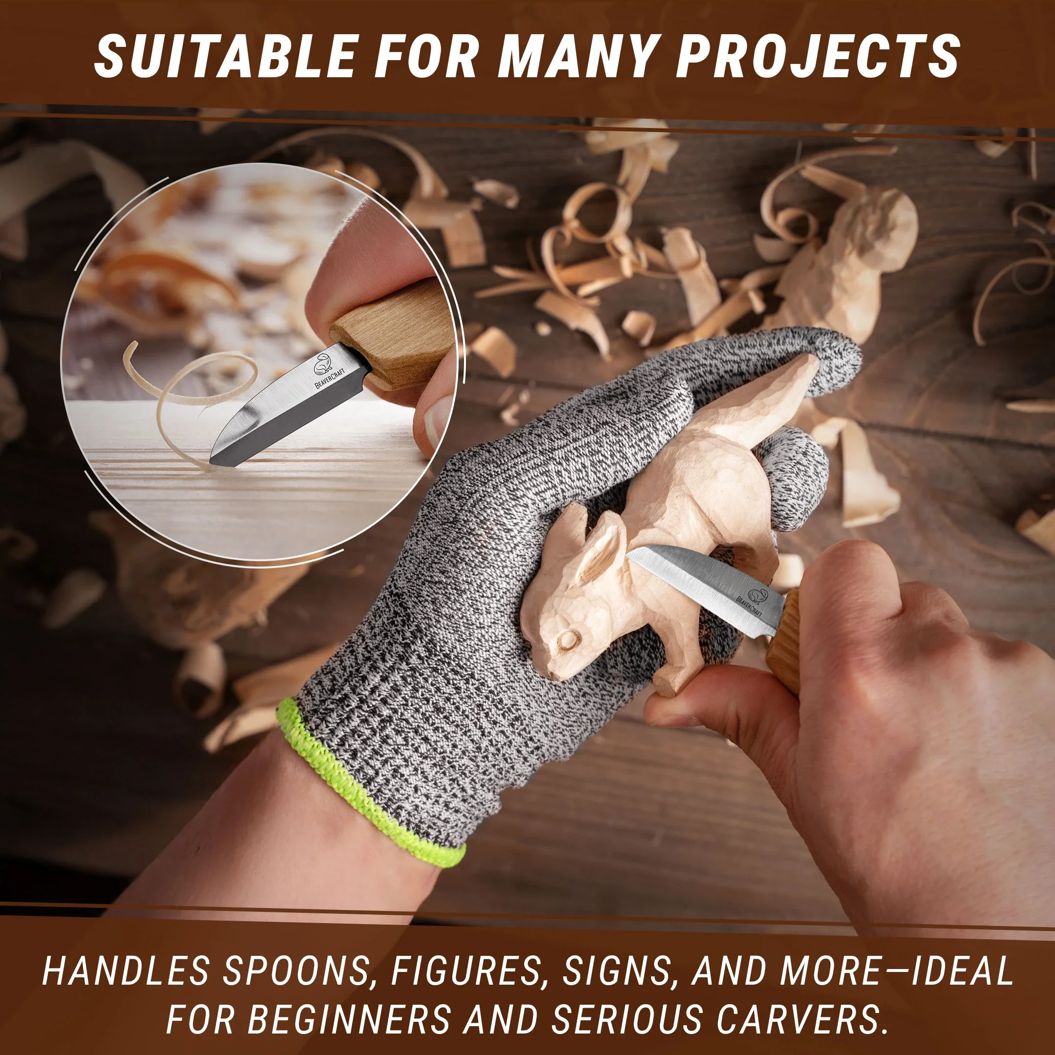 Mit diesem Holzschnitzmesser kannst du kleine individuelle Holzdekorationen und handgefertigte Holzspielzeuge schnitzen sowie Figuren von Tieren, Menschen und Automodellen. Die Vielseitigkeit des Schneid-/Schnitzmessers BeaverCraft C2 liegt in seiner Multifunktionalität: Du kannst dieses Schnitzwerkzeug in der Anfangsphase des Schnitzprozesses und zum Schnitzen von Ornamenten, Kerben, Wölbungen und figürlichen Schnitten verwenden.
